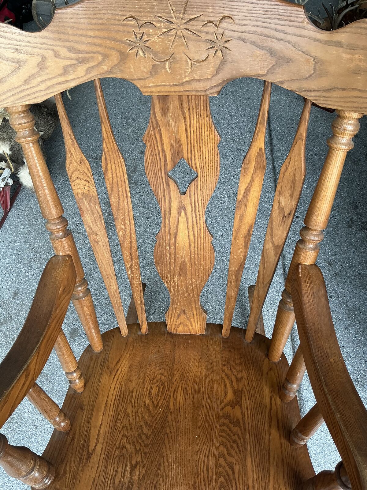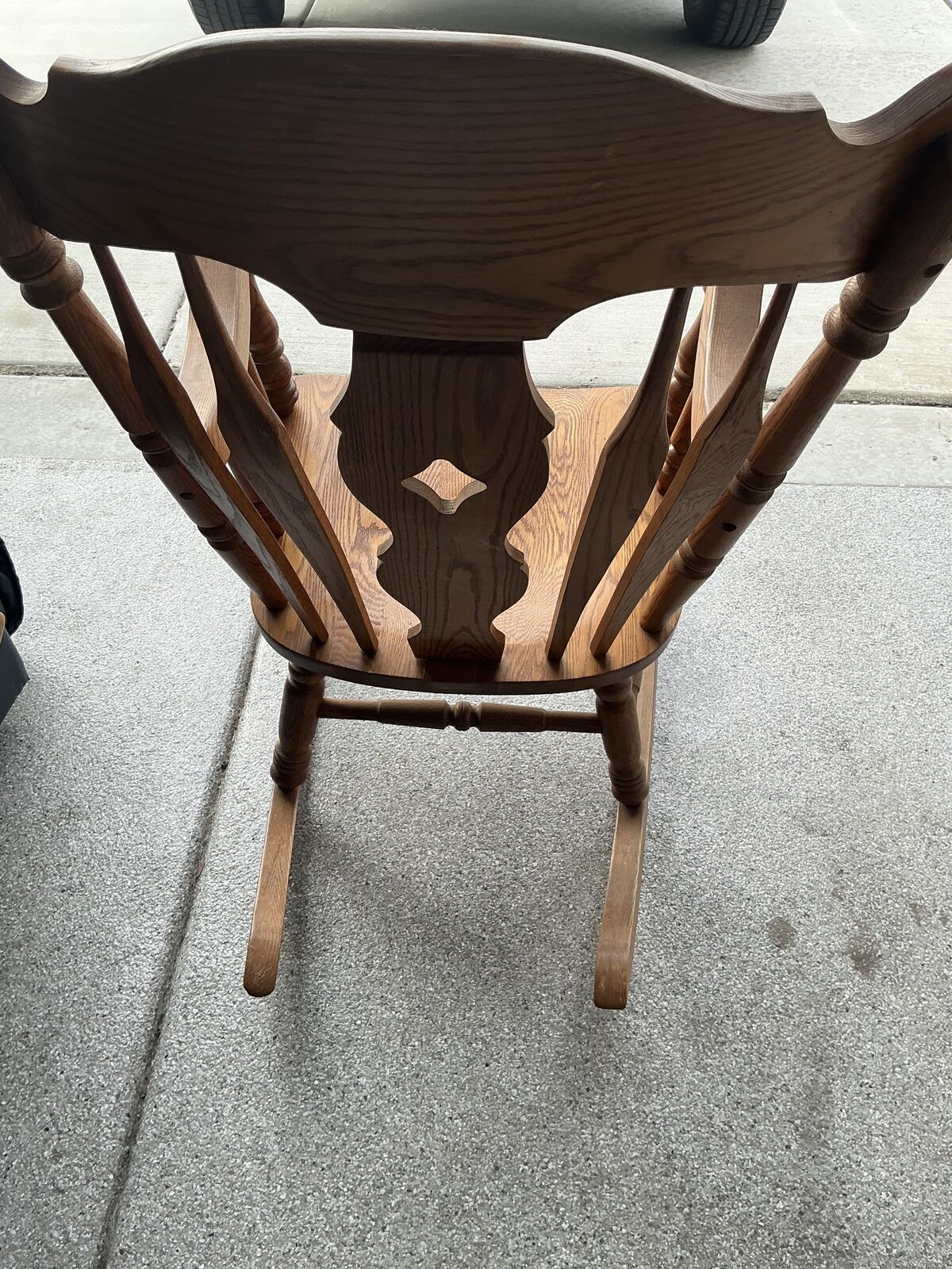 ZelleVery nice and super well built solid Oak Rocking Chair. Please see the pictures, the finish isn't perfect but still show good and it's made from solid oak!