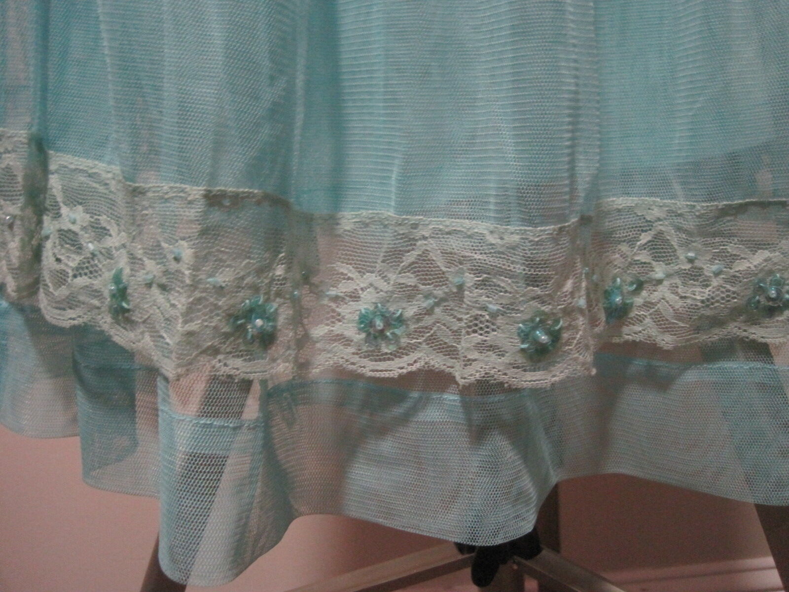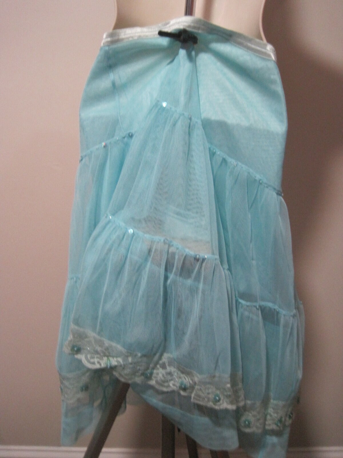 This women's size small long skirt in light blue and white floral lace with fringe accents is perfect for parties or cocktails. Made of lightweight polyester, this mid-rise flare skirt features a zip closure and is great for the summer and spring seasons. The intricate floral pattern and sequin accents add a touch of elegance to the garment, making it a stylish addition to any woman's wardrobe. Perfect for those looking for a light blue and white floral skirt with a flair.