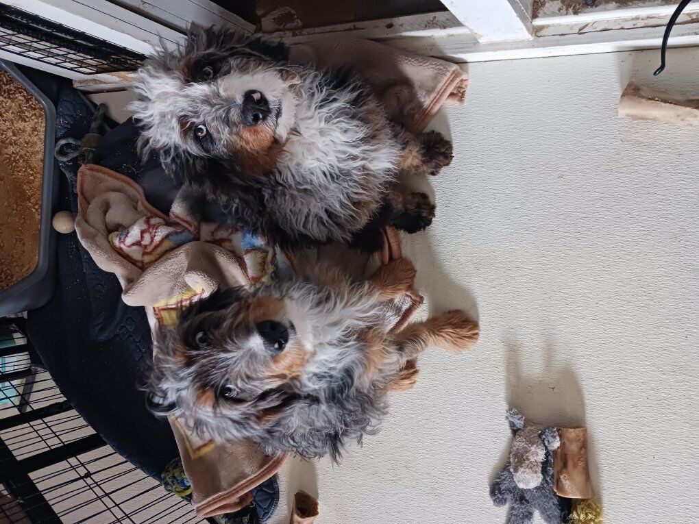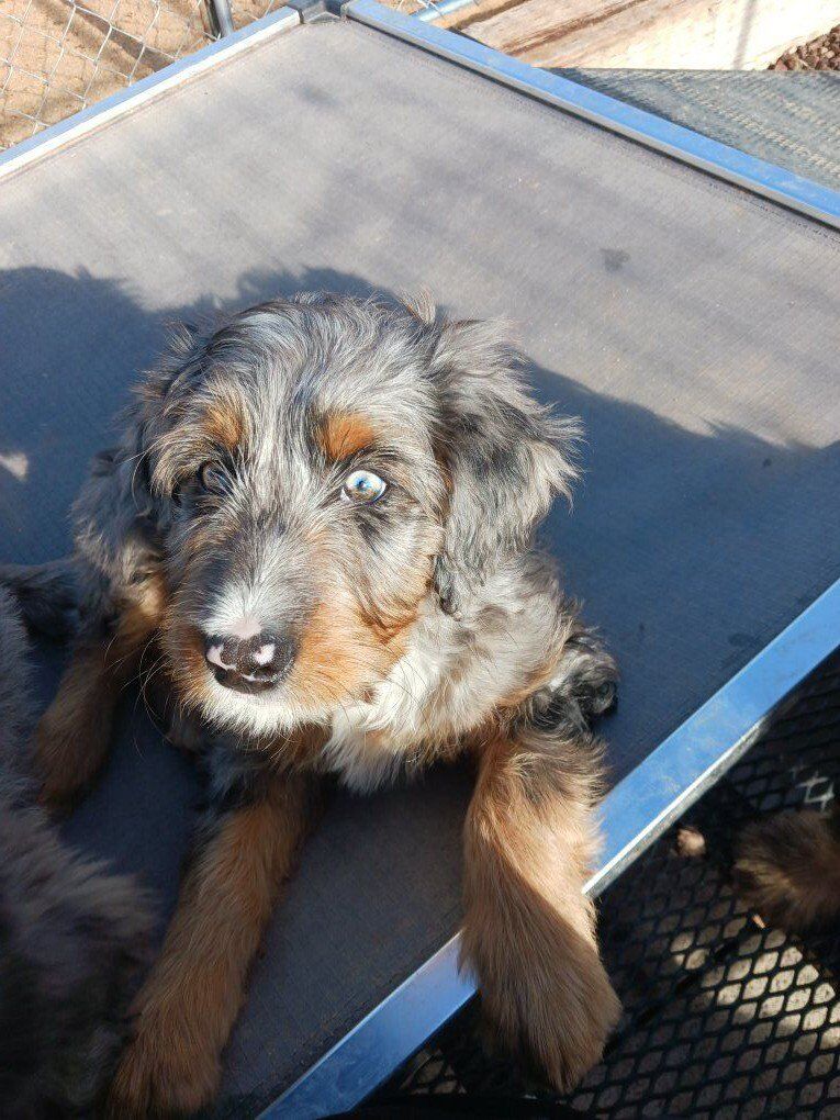 Zellemoyen (mid size) multi generational bernedoodle. Mom is 80 lb, health tested and OFA cleared f1 ( from health tested and OFA cleared AKC Bernese mountain dog, bred to health tested and OFA cleared AKC standard poodle) blue Merle Bernedoodle with white points. Dad is 40 lb, health tested and OFA prelimin cleared f2 moyen (health tested and OFA cleared moyen bernedoodle bred back to health tested and cleared AKC mini poodle), tri phantom with white and copper points. Pups born Oct 31, ready to go. they have had all 3 shots, worming and vet clearance. will need rabies at 6 mo. started ENS at birth, piddle pad trained at 16 days, then litter box trained with pine pellets. trained to come when called, sit, sit for attention and treats, sit and wait for playpen gate to open, dog door trained, down, and are learning shake and wave and chase the ball. raised in living room around cats and dogs and house of people, being fussed over and trained daily. crate trained, working on leash next. absolute best foundation to be trained into service, therapy or esa. solid groundwork is completed. dark tri phantom Merle girl with copper points, been calling her Tribble. blue eyes, umbilical hernia $2500. sweet and cuddly and sensitive. needs a bit of time to learn and then seems to retain it longer then littermates, more submissive in temperament, in that she wants to please you above all and has a solid try, just to please. tri phantom girl with curly hair, white blaze down face, chest, belly, 1/2 black pattern on back and side. Been calling her QT. Unique markings, $3500. more dominant in personality, though she is sweet and cuddly, she wants to please herself first, then will try to please. she's super quick to learn, but has no problem doing her thing. she would be good with a disabled handler that needs a dog that can think for herself, and learn intelligent disobedience, until given the proper command.