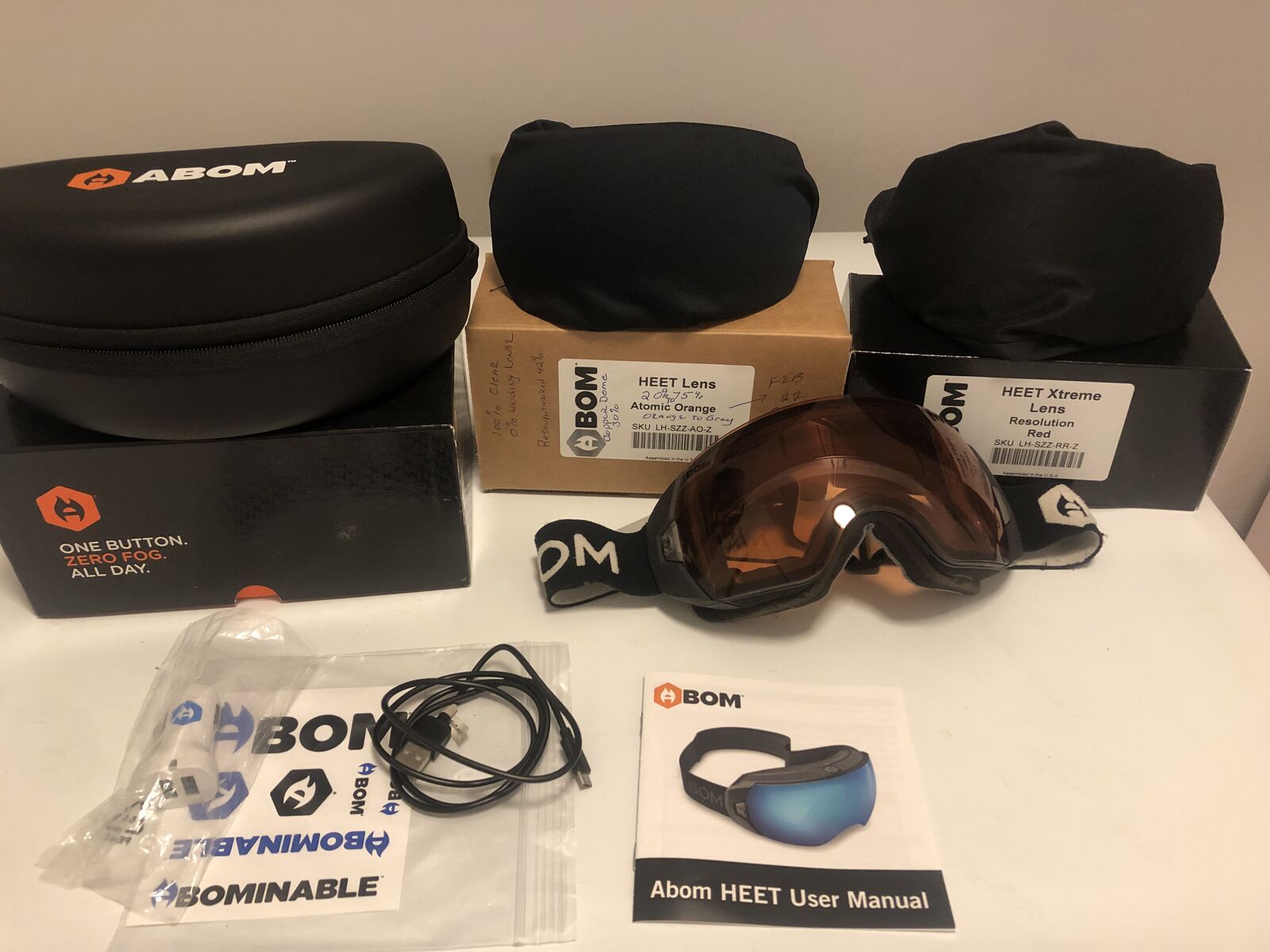 PayPalBarely Used a full set of A Bom Heated goggl;es complete with 3 lenses . 2 lenses have never been installed/used- all lenses have protective sleeves. I will included hard case for the goggles. Comes complete with Instructions, charger and charging usb cable.