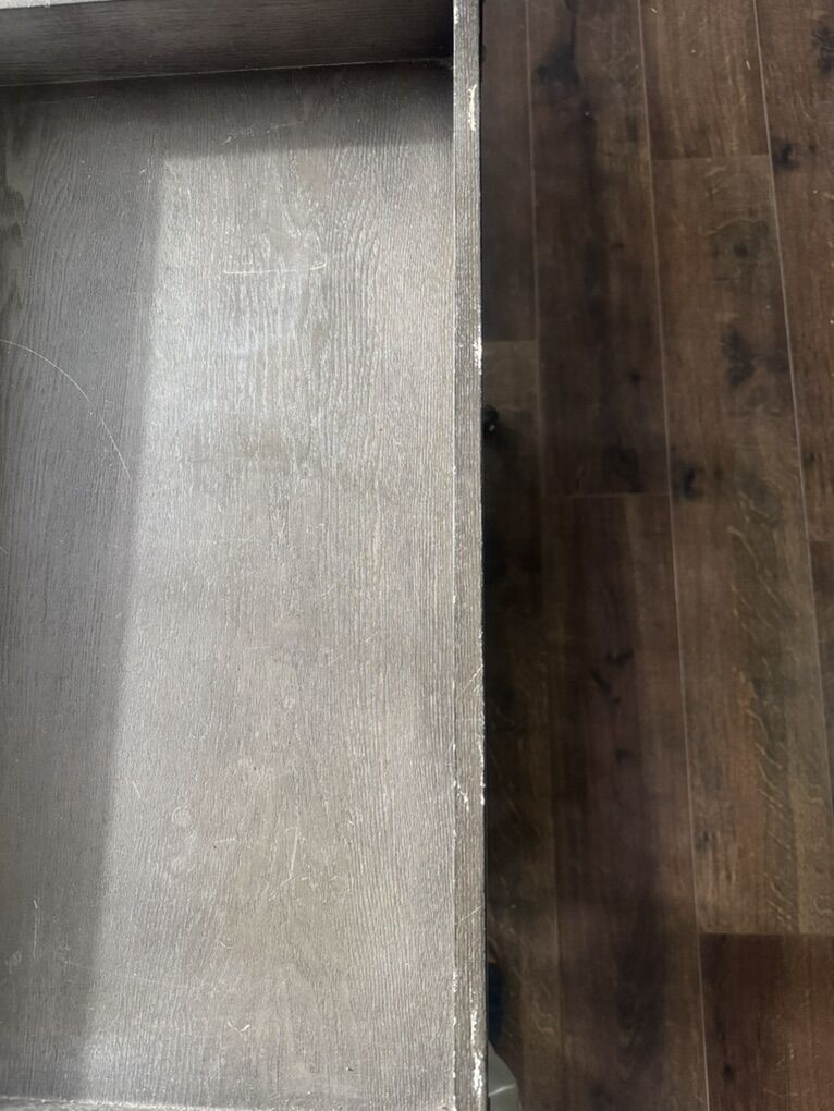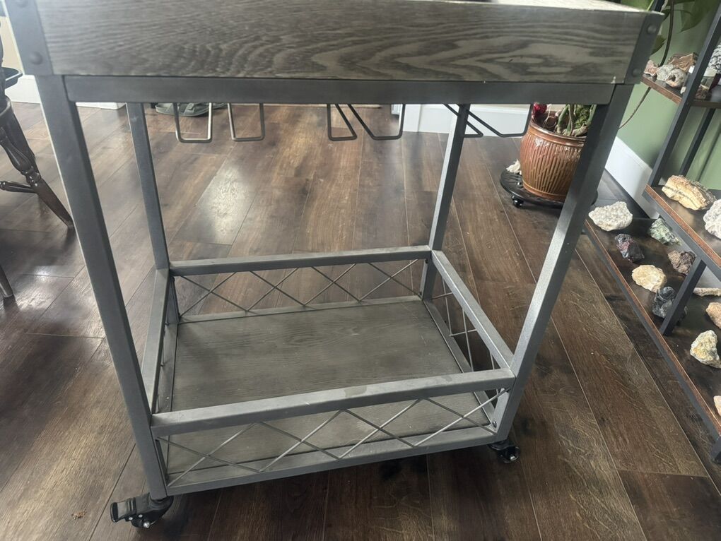 VenmoHas a little bit of scuffs and scratches on the top shelf (pictured) but overall in good shape. Fits a lot of stuff on it and can hang glasses underneath the top shelf. Measures 33”h x 18”w x 26”d (30”d including handle). Has two locking wheels.