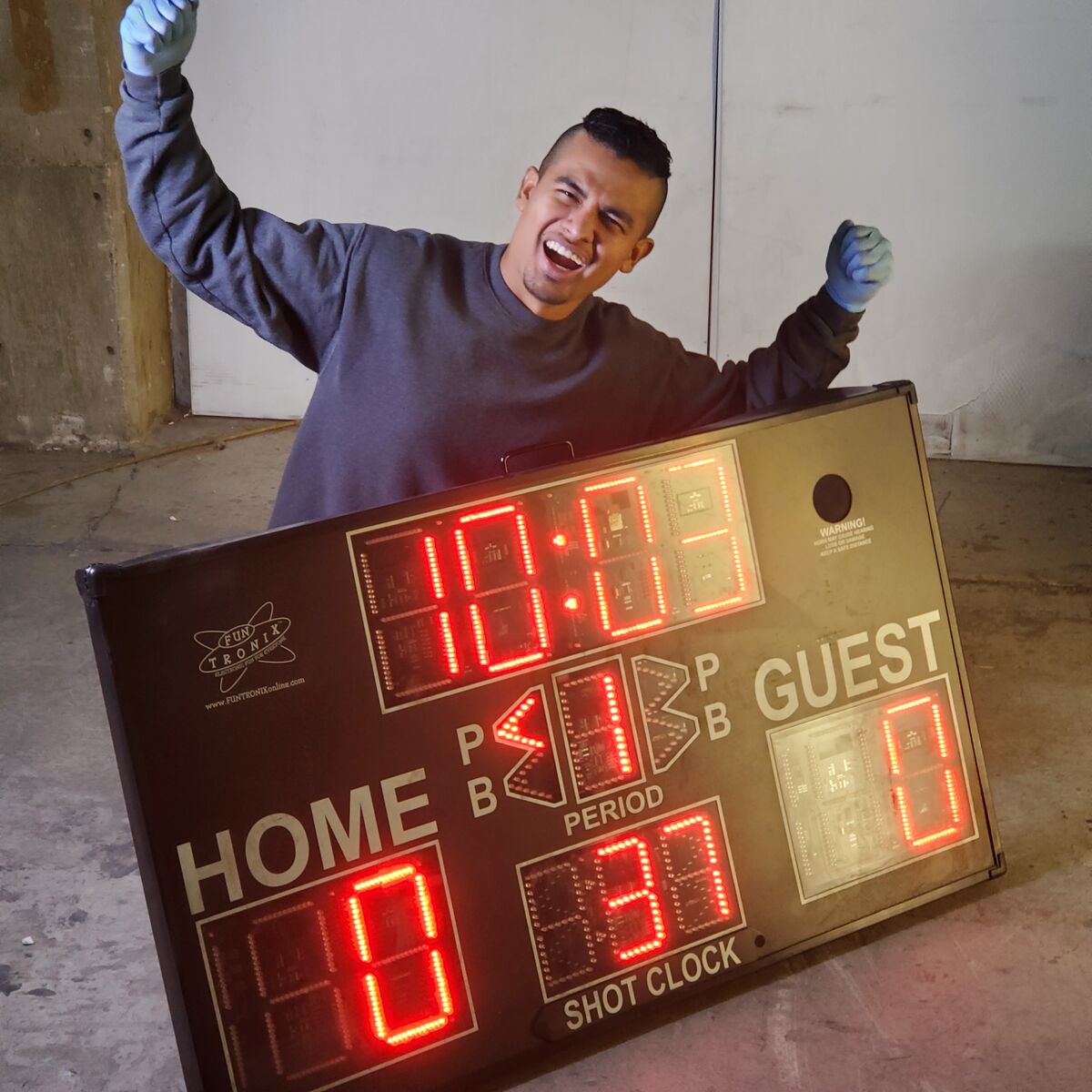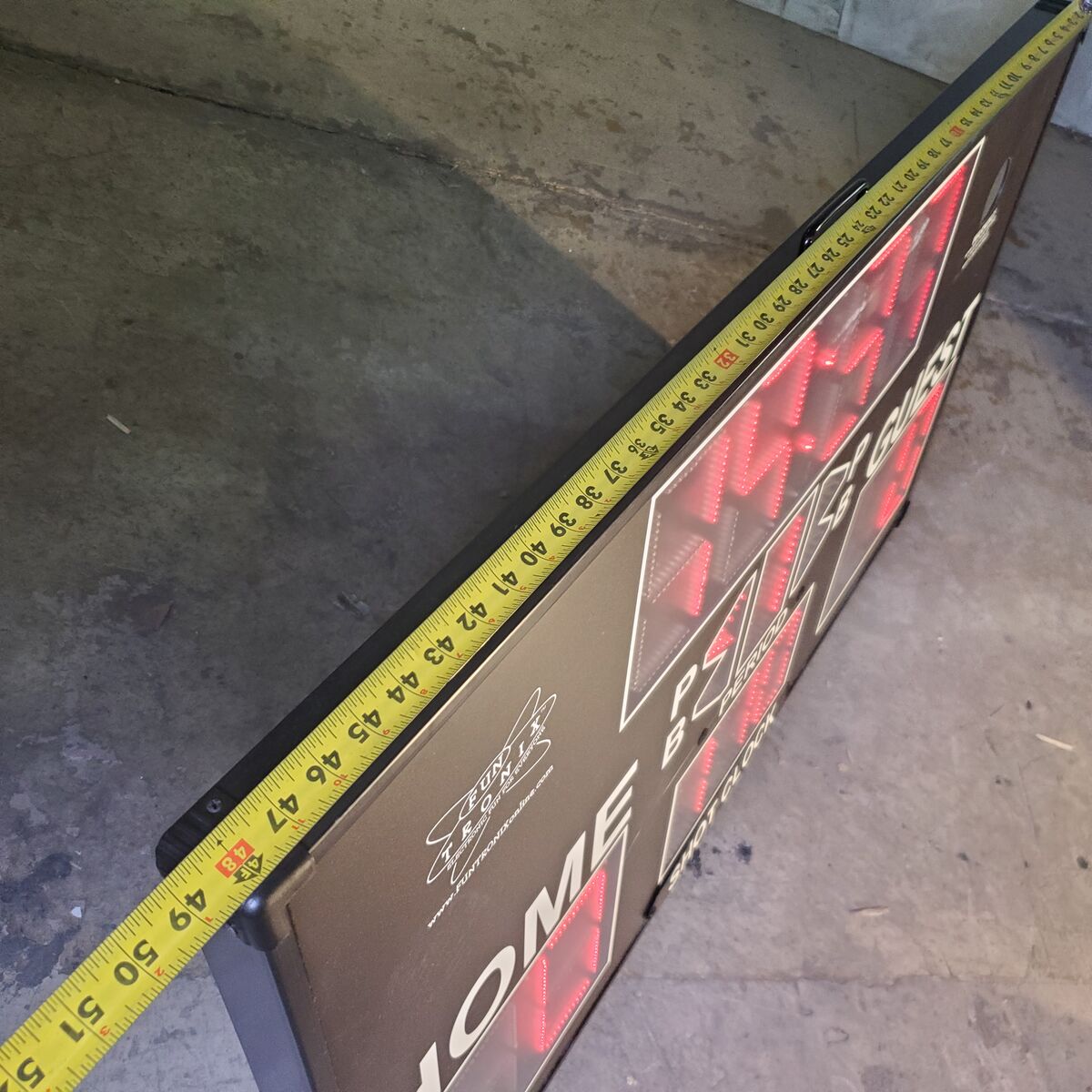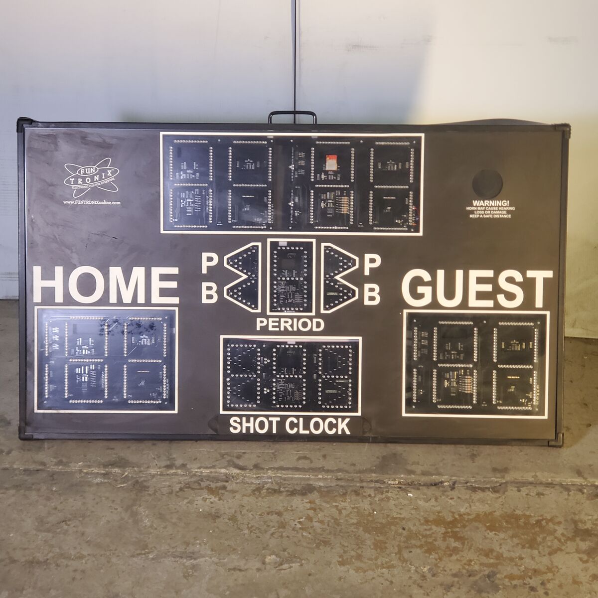 FUN TRONIX Very Light Easy to Mover Around Portable Multisport Scoreboard Without Power Cable & Remote Condition: Pre-Owned, Damaged Frame but Working - Cracked corner on frame and minor scuffs from use. (See images) Size: 28"x48" MPN/Model: SNT-800M