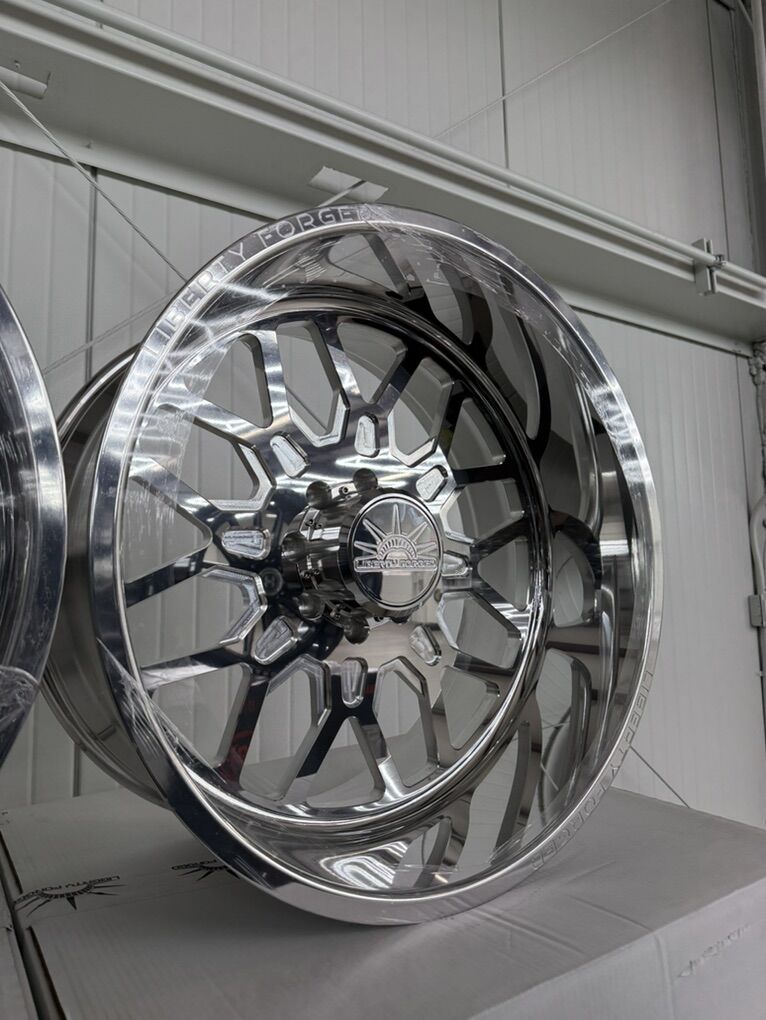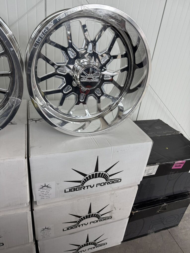 ApplePayBRAND NEW LIBERTY FORGED WHEELS IN STOCK SPECS. 24x12 liberty forged LBTY29, -44 offset, mirror polished finish, with billet floating caps to top them off. Wheels are brand new in the box. These wheels are normally a 8-10 week wait time, and usually go for $5500.