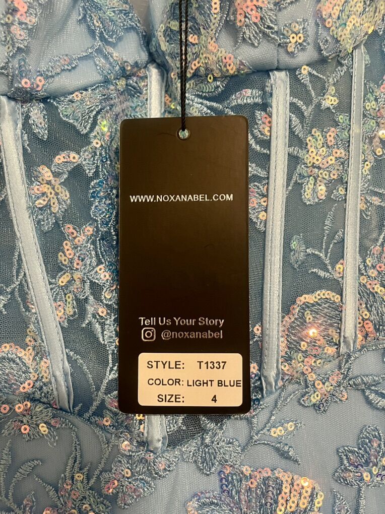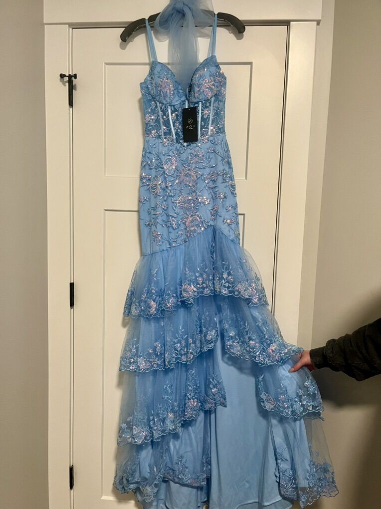 VenmoNew with tags. Junior size 4. Beautiful baby blue color, slit up on leg. The lace and details are beautiful. Purchased at Bliss for $400.00