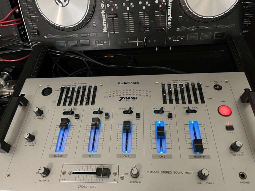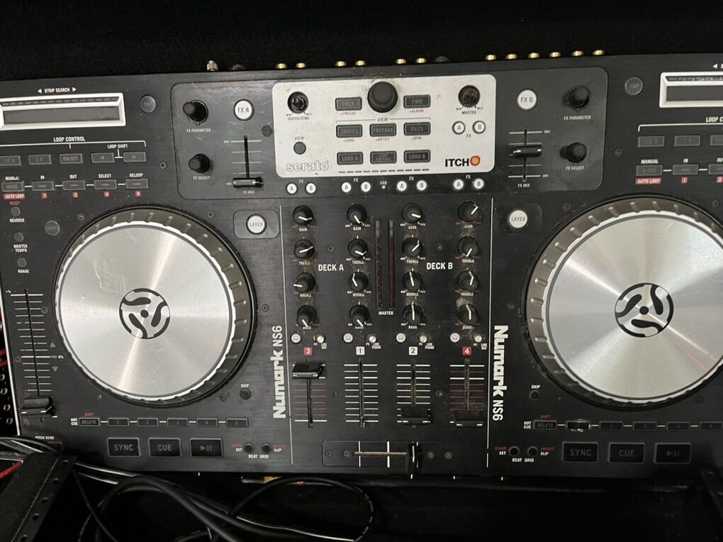 Numark NS6 4 Channel digital mixing board. You’d use this and the turntables to make 4 channels.