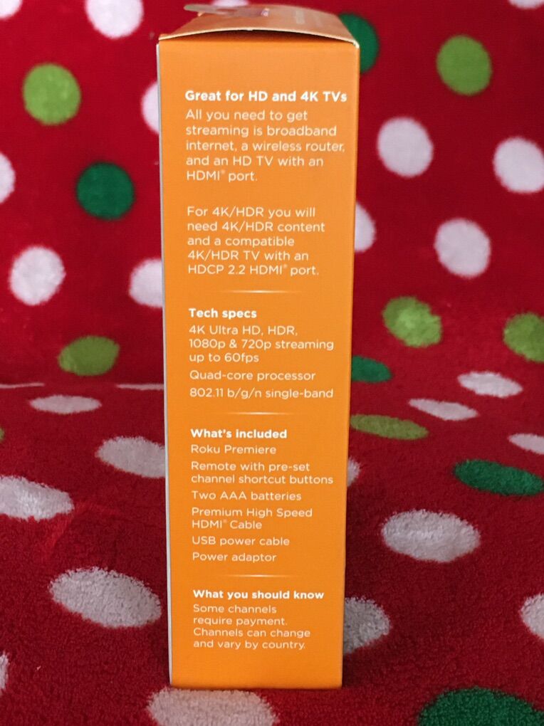 Roku Premiere HD/4K/HDR Streaming Media Player, Simple Remote and Premium HDMI Cable, Black Supports 4K Ultra HD and HDR picture quality. It connects to TVs via HDMI and includes a simple IR remote with shortcut buttons. Key features include 802.11 b/g/n Wi-Fi, Apple AirPlay support, and compatibility with voice assistants like Alexa and Google Assistant