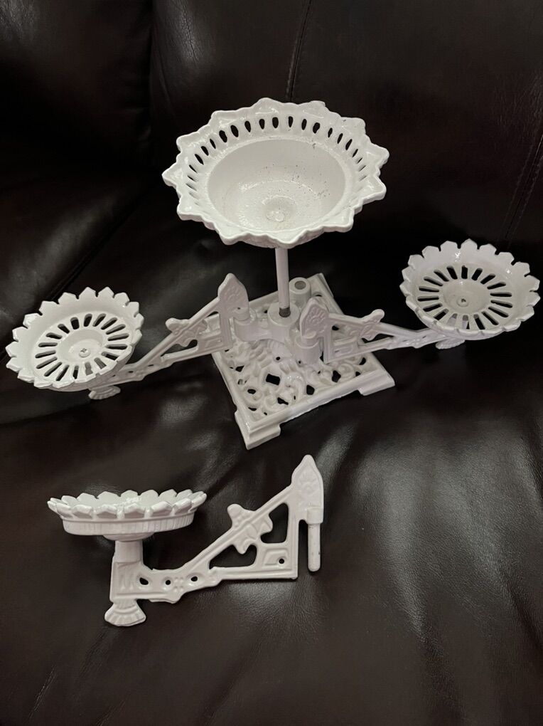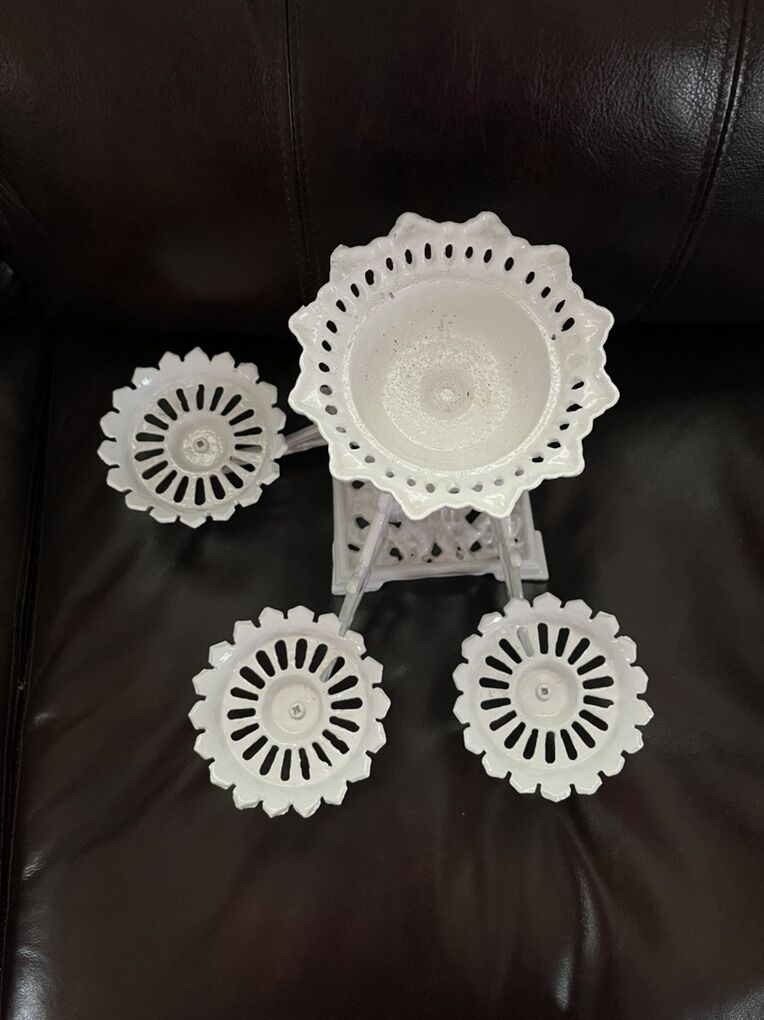 VenmoThis is an quite unusual plant stand. It is heavy and made of cast iron. It appears to have been painted with a powder coating, that is a beautiful glossy white paint. The arms move and are removable. With the arms all spread it measures 15 inches. The height is 10 1/4 inches tall. The base is square and is 5 3/4 inches. The top holder is larger than the other three. It measures 5 1/2 inches wide. Inside the pot it measures 3 1/4 inches wide x 1 3/4 inches deep. The other three are all the same. They measure 4 1/4 inches wide, the inside pot measures 3 1/4 inches x 5/8 inch deep. Perfect to sit on a table top. This is marked Japan on the bottom. A very fun and pretty piece. Selling for a parent. Price is firm.