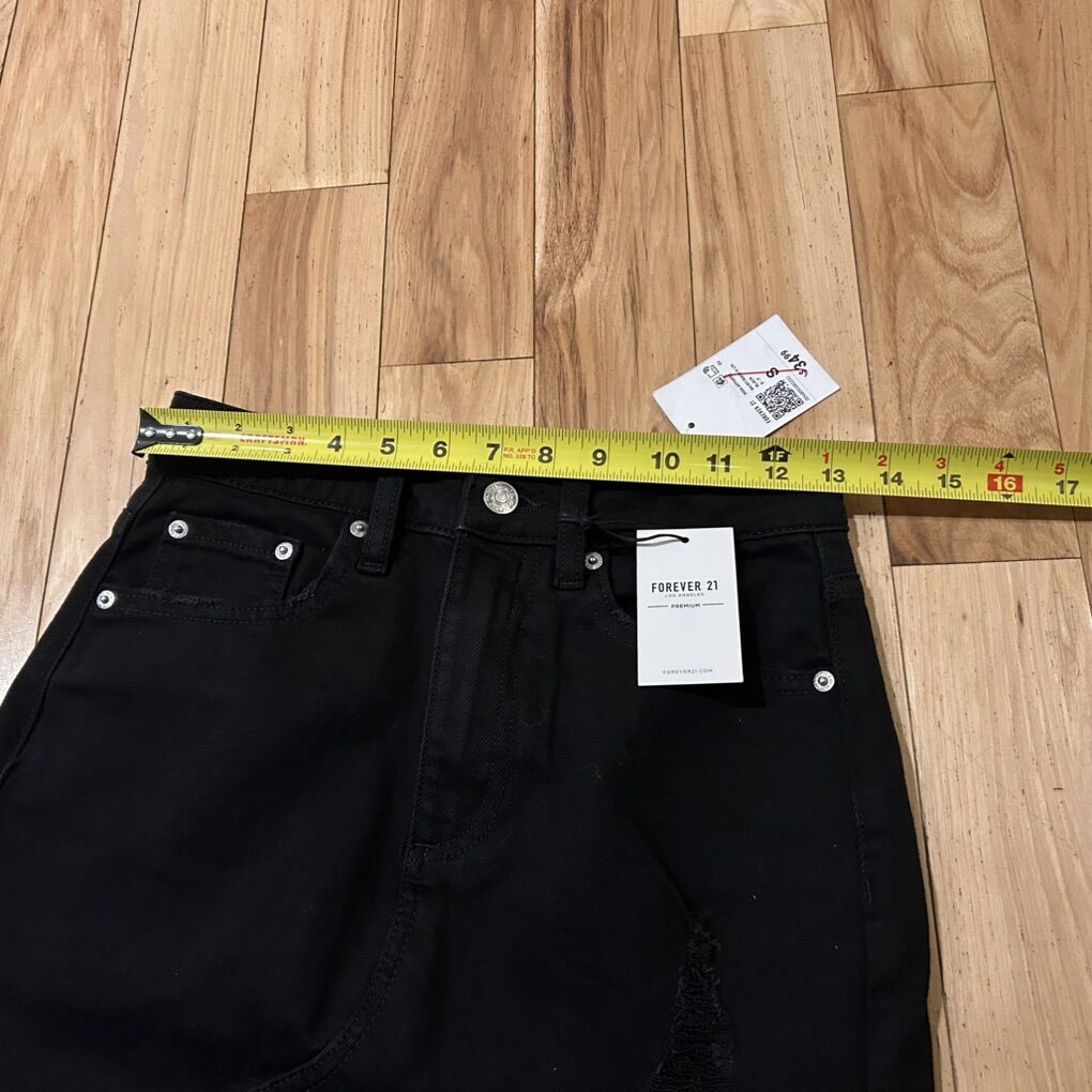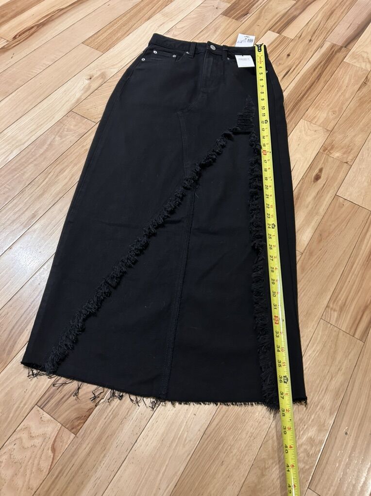 Forever 21 BWT Black Denim Long Midi Jean Skirt with Distressed High Front Slit - Women’s Size Small - distressed hemline and factory rip front slit - with pockets and button and zipper fly closure - brand new with tags.