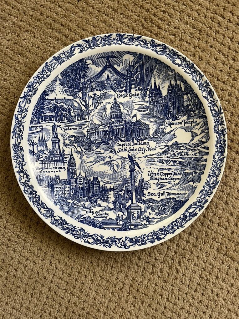These Salt Lake City plates are hard to find, especially in blue. This plate is in mint condition. This was made by Vernon Kilns, which operated from 1931 - 1958. This plate was made during this time frame. The scenes on this plate are the Utah State Capital Building, Church of Jesus Christ of Latter Day Saints Mormon Temple, the Tabernacle, Eagle Gate, Brigham Young Monument, Seagull Monument, Utah Copper Mine Bingham Canyon, and a City County Building. The plate is 10 1/4 inches across. This has a white background with a beautiful floral band border. The colors are vibrant. There is no chips, cracks, or crazing. The back says Salt Lake City, UTAH and By Vernon Kilns This is a stunning piece of Utah history. It would be beautiful displayed. I will not ship this. Selling to help a parent. Price is firm.