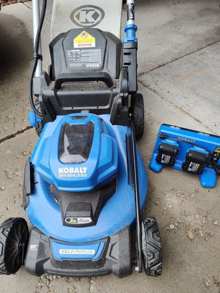 Kobalt lawnmower for sale with batteries and charger still in great shape! Only used for 1 summer. Brushless electric mower. Will be moving soon and no longer have the need for it. Thanks for looking!