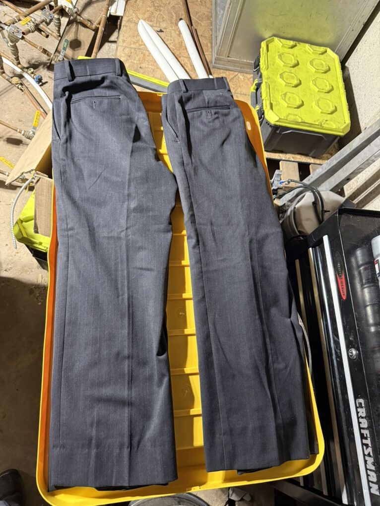 Selling my old Finchley black 2 pant suit. It is a size 36 short. Pants are a 30 waist and 30 length. One pair of pants has a slight stain on it so it could use a dry cleaning. Suit has been stored folded for a few years and I no longer wear it. Asking 100 obo