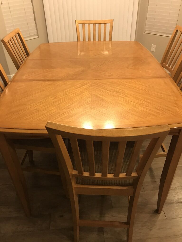 ZelleTall dinning room table w/leaf and 6 padded chairs. Table/chairs are in good condition. The tabletop has a couple of rings from a cold dish in 1 spot.