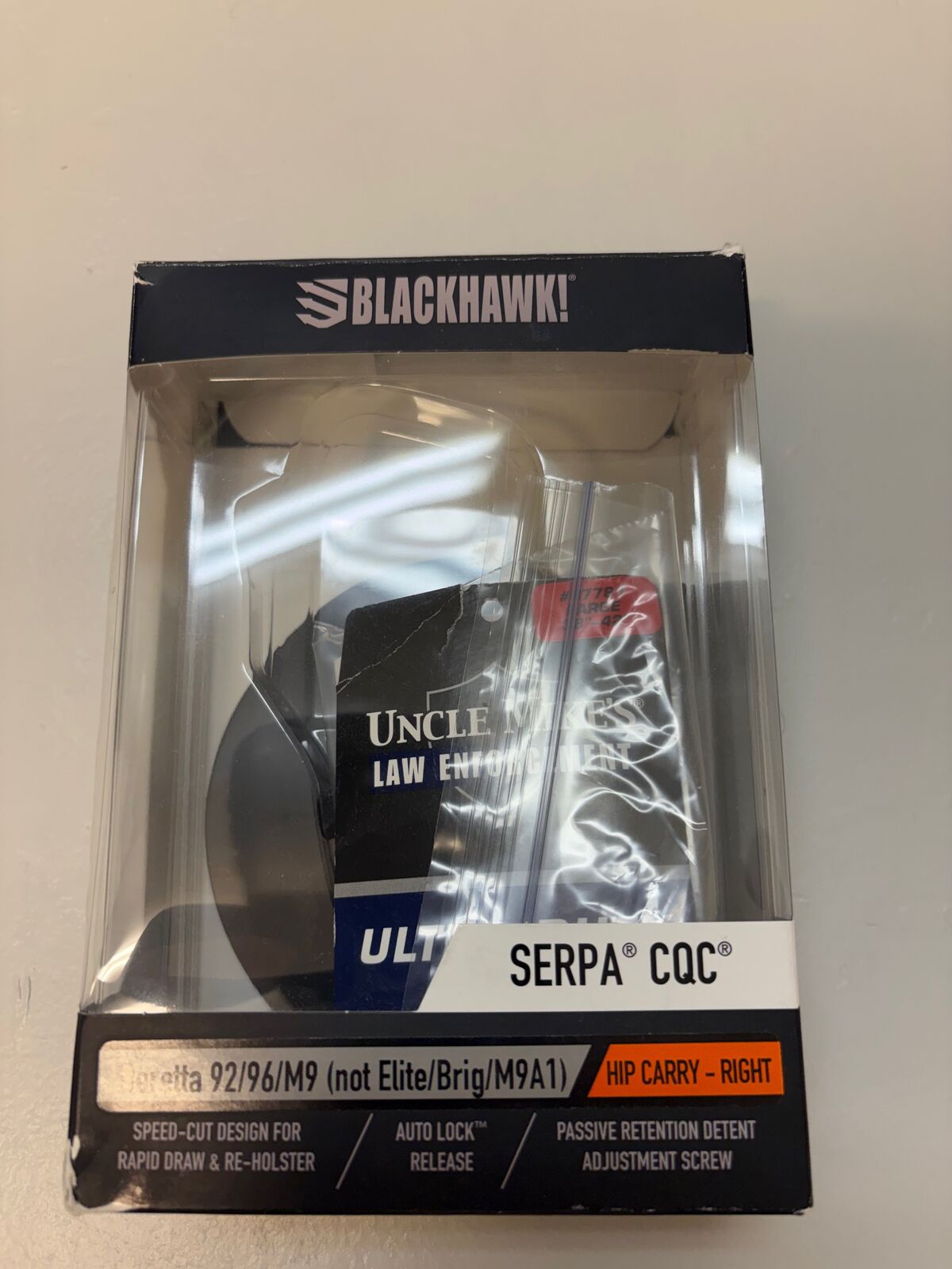 New never used Uncle Mikes Blackhawk Ultra Duty Serpa CQC Law Enforcement Duty Belt with holster and double magazine holders. Hip carry right side. Outside type. For Beretta 92/96/M9. Not Elite/Brig/M9A1. Size large 38-42". New cost is $75.00 Selling for $50.00