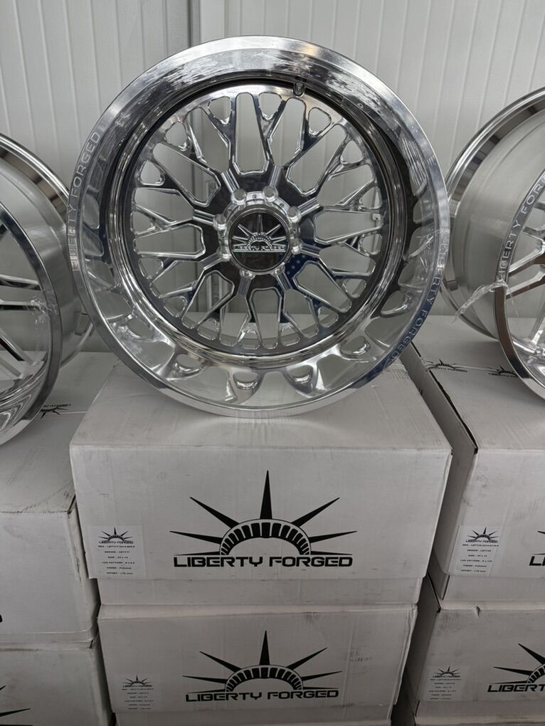 ApplePayBRAND NEW LIBERTY FORGED WHEELS IN STOCK SPECS. 24x14 liberty forged LBTY38, -44 offset, mirror polished finish, with billet floating caps to top them off. Wheels are brand new in the box. These wheels are normally a 8-10 week wait time, and usually go for $5900+