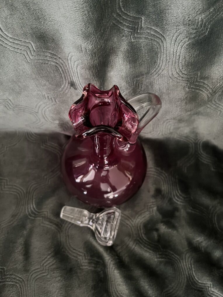 VenmoThis is in excellent condition. It is just a stunning piece. This is 9 inches tall x 4 3/4 inches wide. I believe it is from the late 1850's- to the early 1900's. The decanter is cranberry glass and the handle and stopper are a clear glass. The unusual thing about this decanter is the bubbles in the cranberry glass. They are at the round part, at the bottom of the decanter. They form a pattern. I believe this was done when it was blown. The top of the decanter has a deep swirl ruffled rim. The clear stopper is octagon shaped and decorative. This does have one tiny flea bite on the very bottom. This is a very lovely Victorian type piece. Must see. Price is firm.