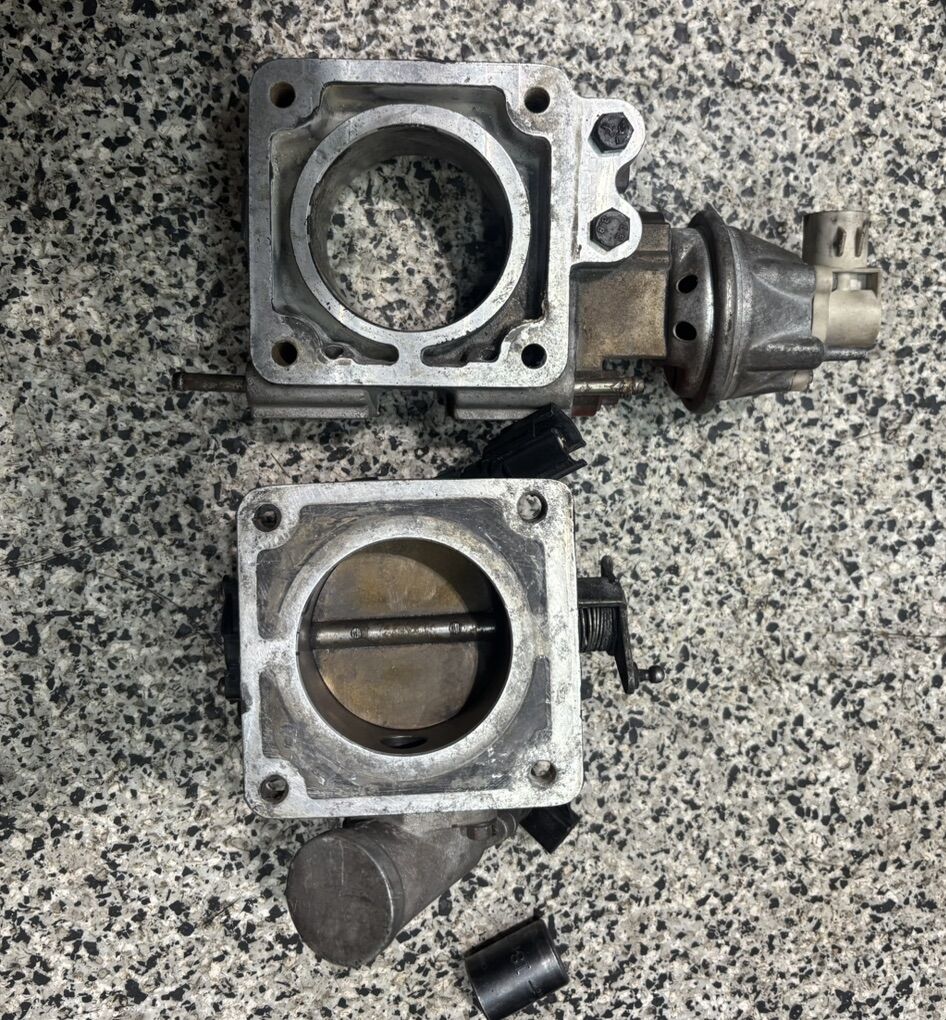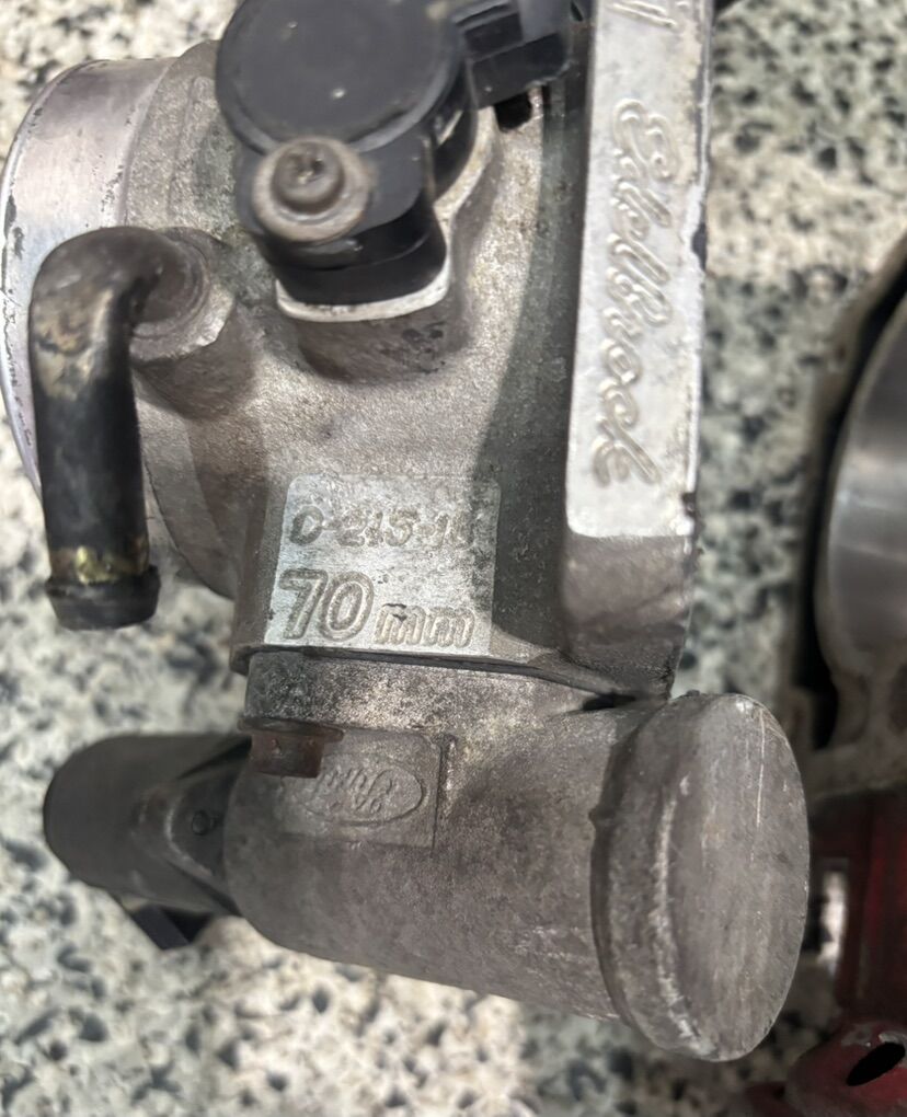This is an Edelbrock BBK throttle body for a Foxbody mustang (1986-1993). It’s 70mm, and it includes the matching EGR spacer, idle air control valve and throttle position sensor.