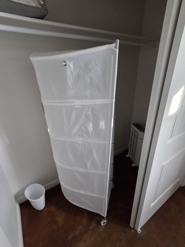 Portable Closet organizer on wheels. It fits inside a regular size closet.