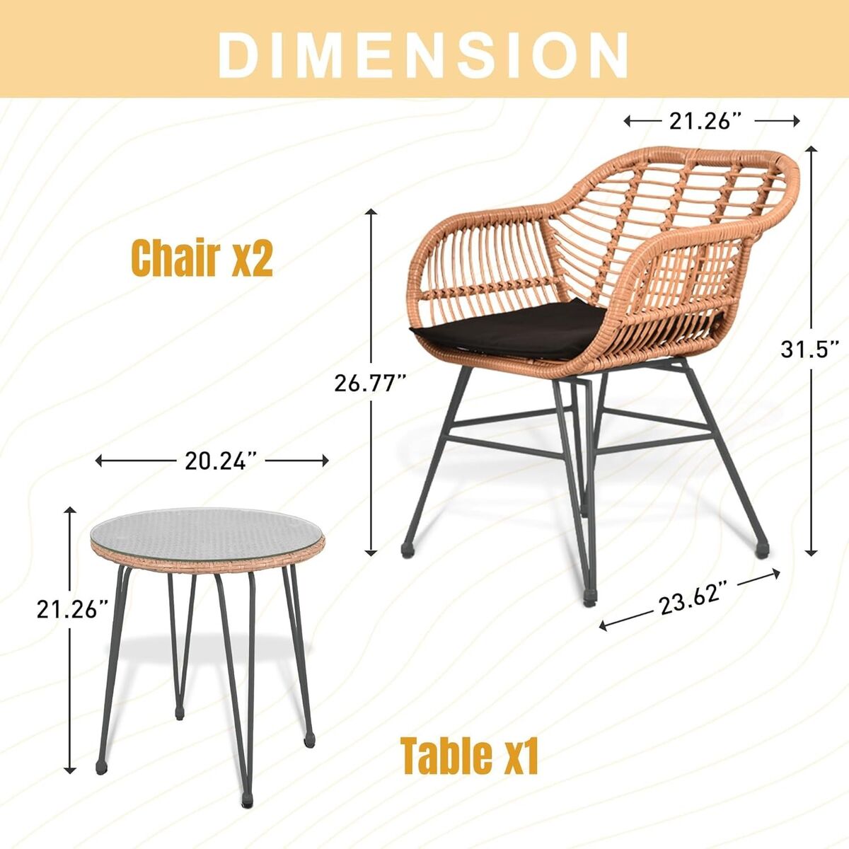 Venmo3 Piece Wicker Furniture Bistro Set, Rattan Conversation Sets, Outdoor Patio Chairs Set BISTRO: This furniture set includes 2x PE rattan armchairs, 1x circular side table, and 2x cushions are Almond NOT BLACK, which is a perfect addition to your home. The luxurious furniture with its elegant outlook, delicate details, and modern tone, will be an artwork piece.