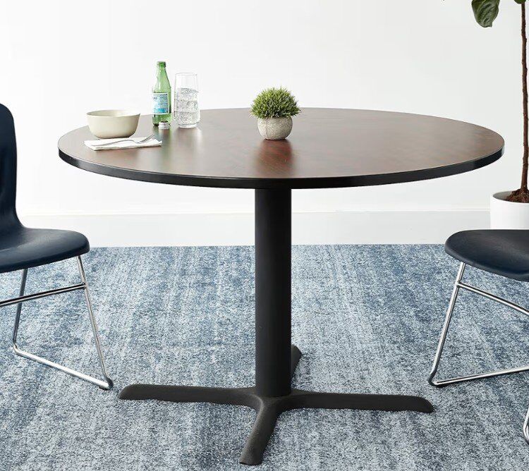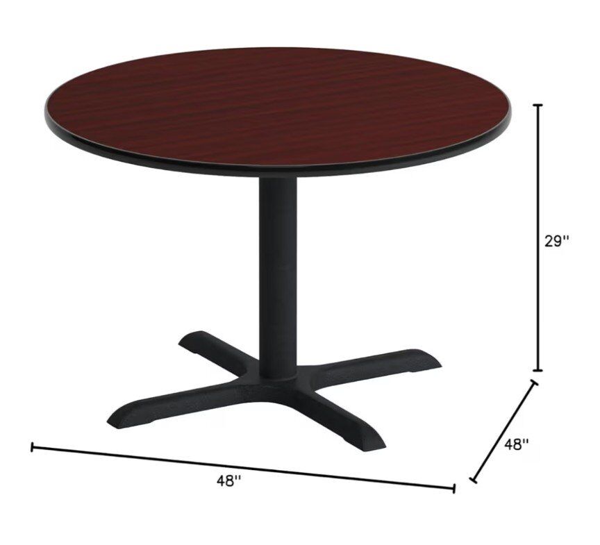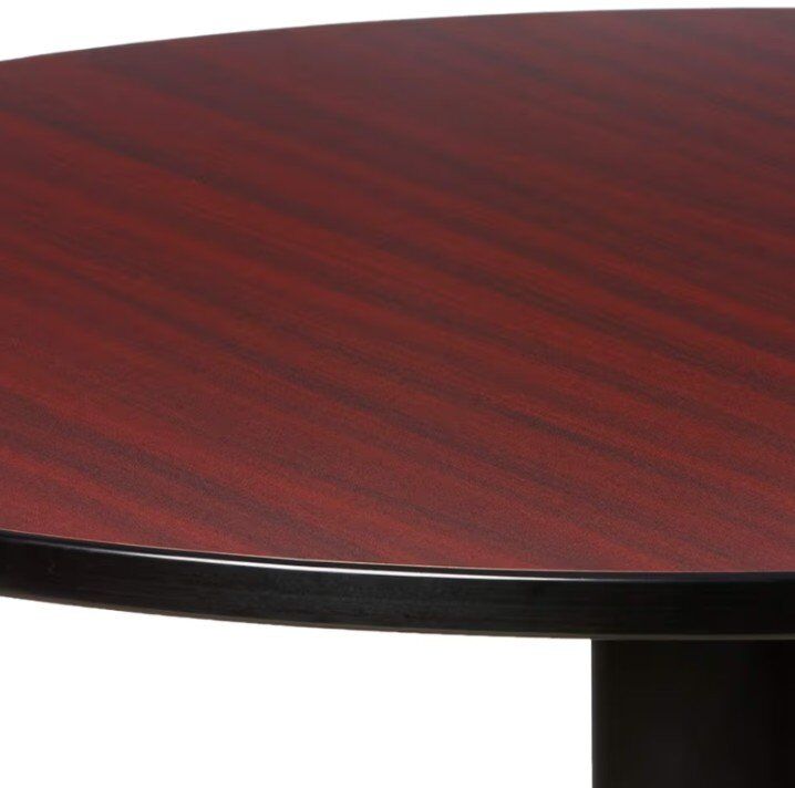 This round table is constructed of a thermal fused melamine laminate tabletop that is 1-inch thick and finished with a black edge band.