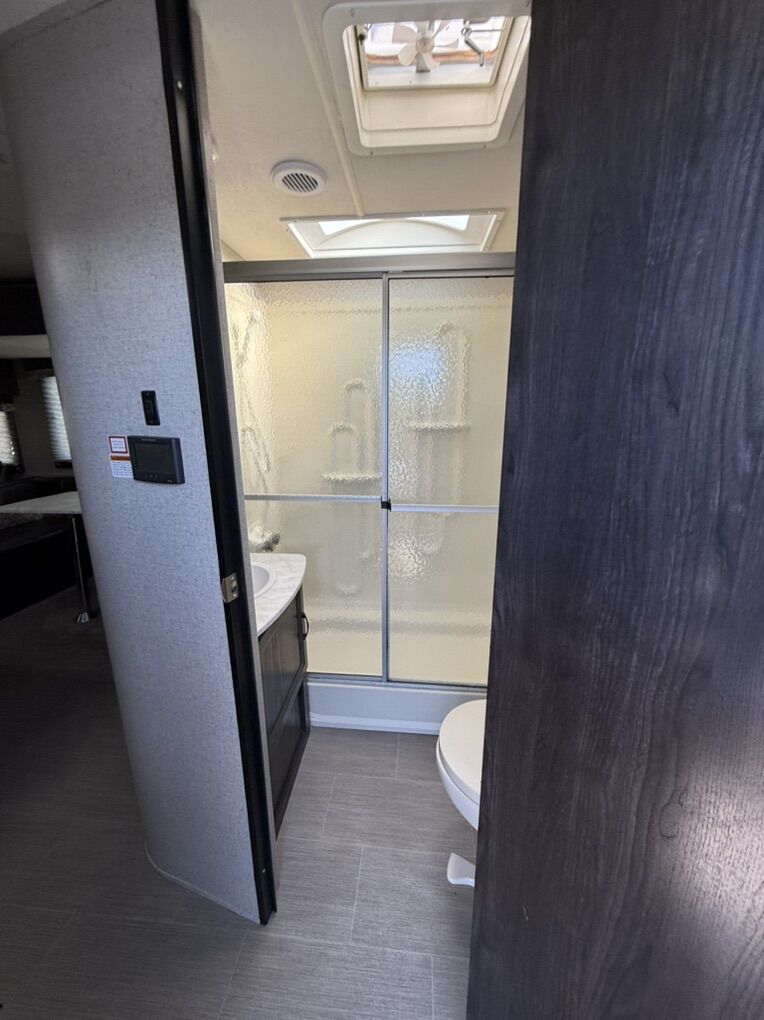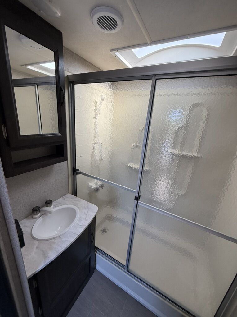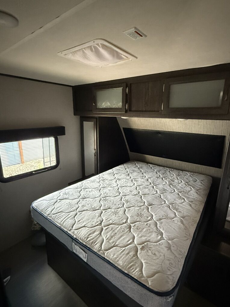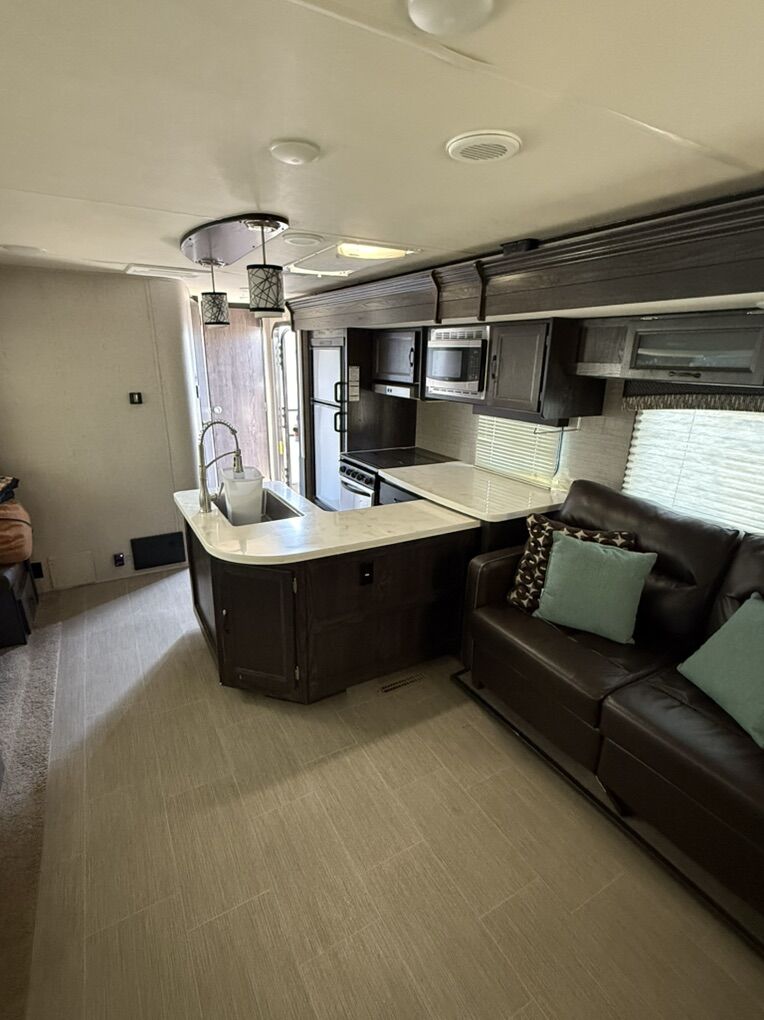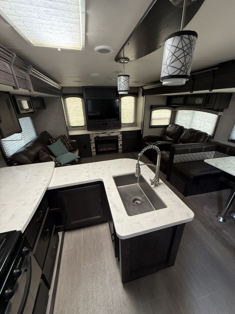 Some features included -Large rear living area with entertainment center -Dual recliners and sofa (fold out couch bed and table bed) -Spacious double slide-out for extra living space -Private front bedroom -Power awning -Automatic leveling system -Outdoor speakers -New tires -High output furnace