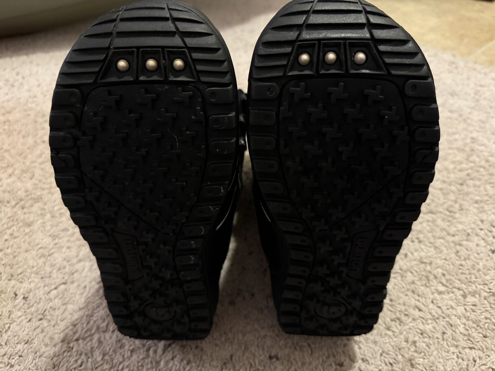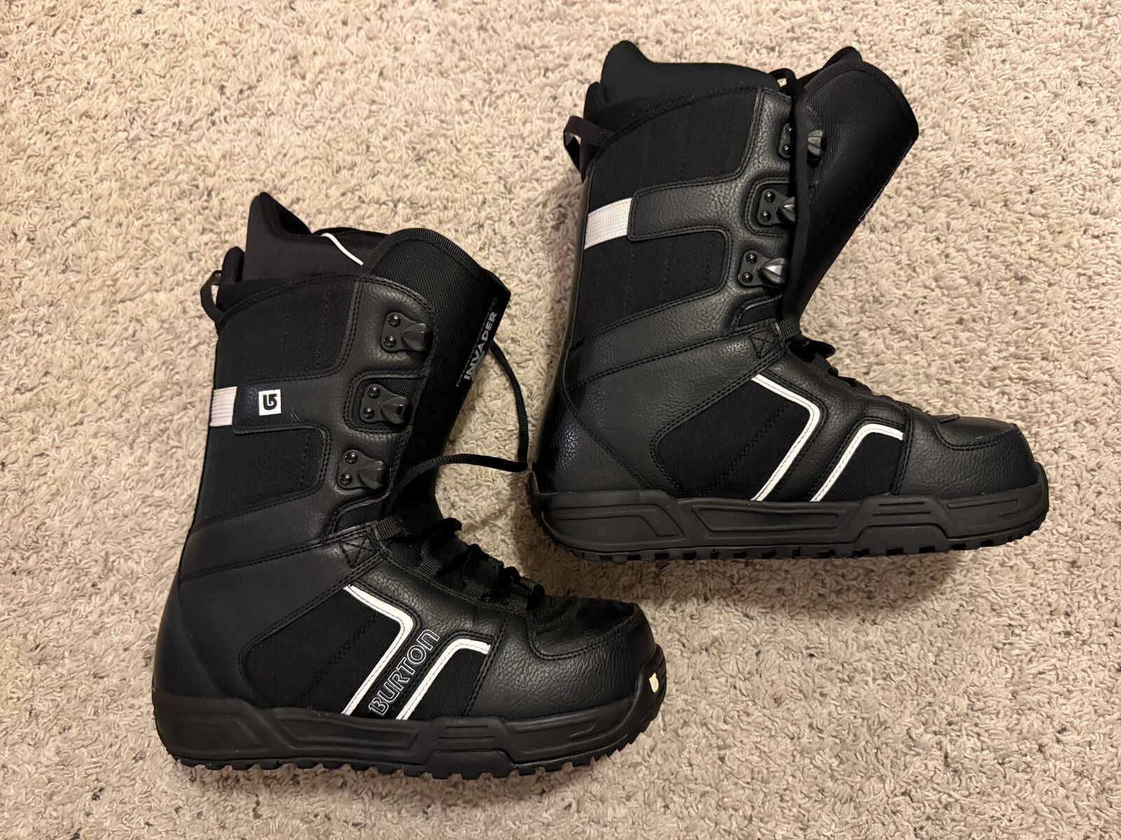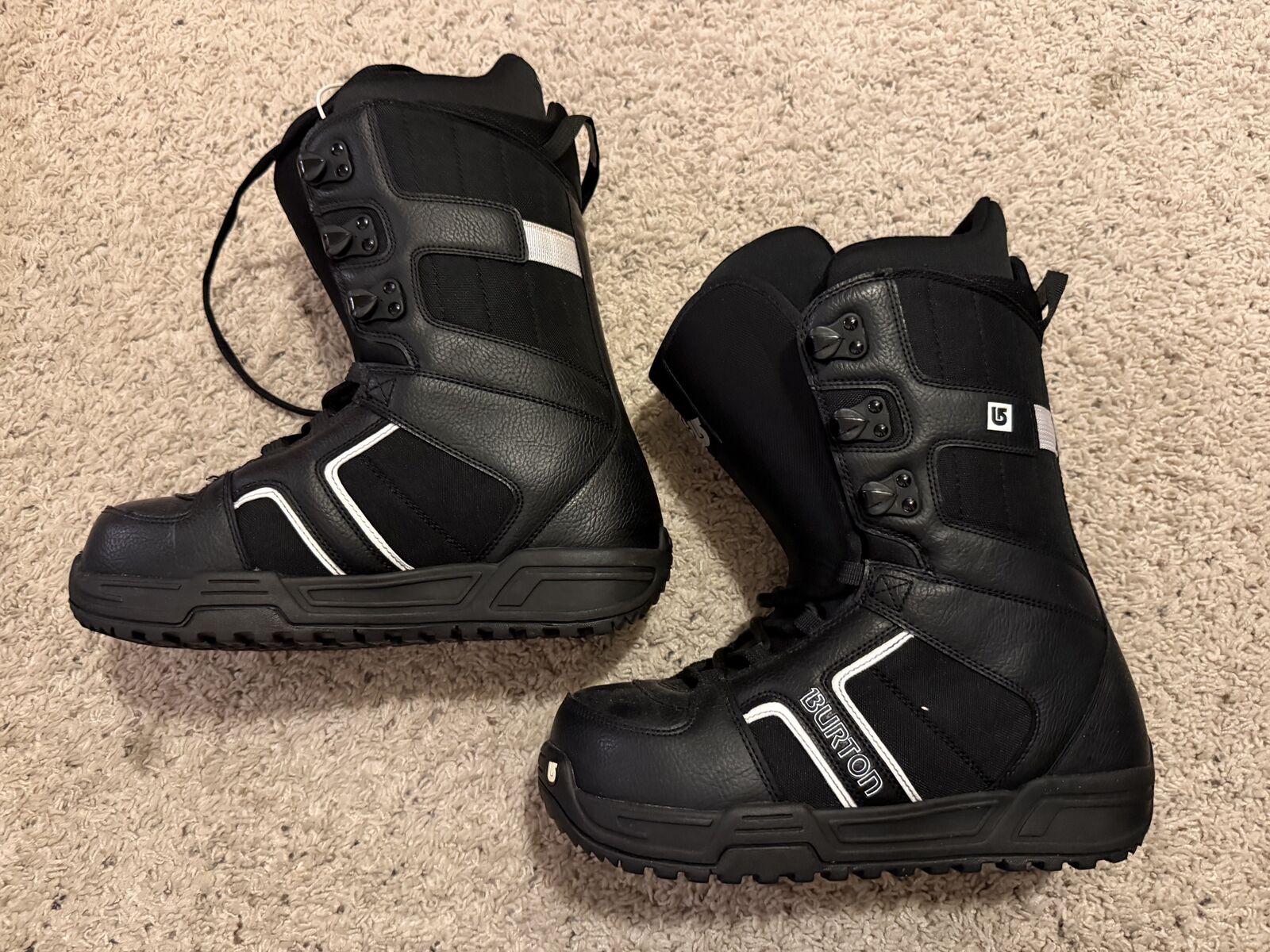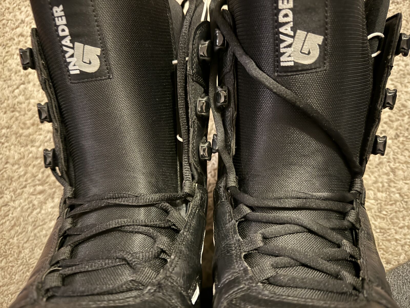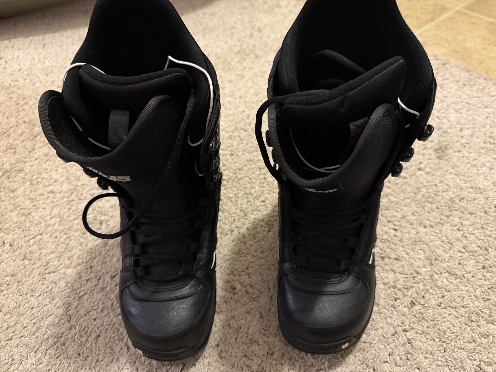Slightly used. Family member ended up not wanting them. The lace on the right boot is not original (see last picture).