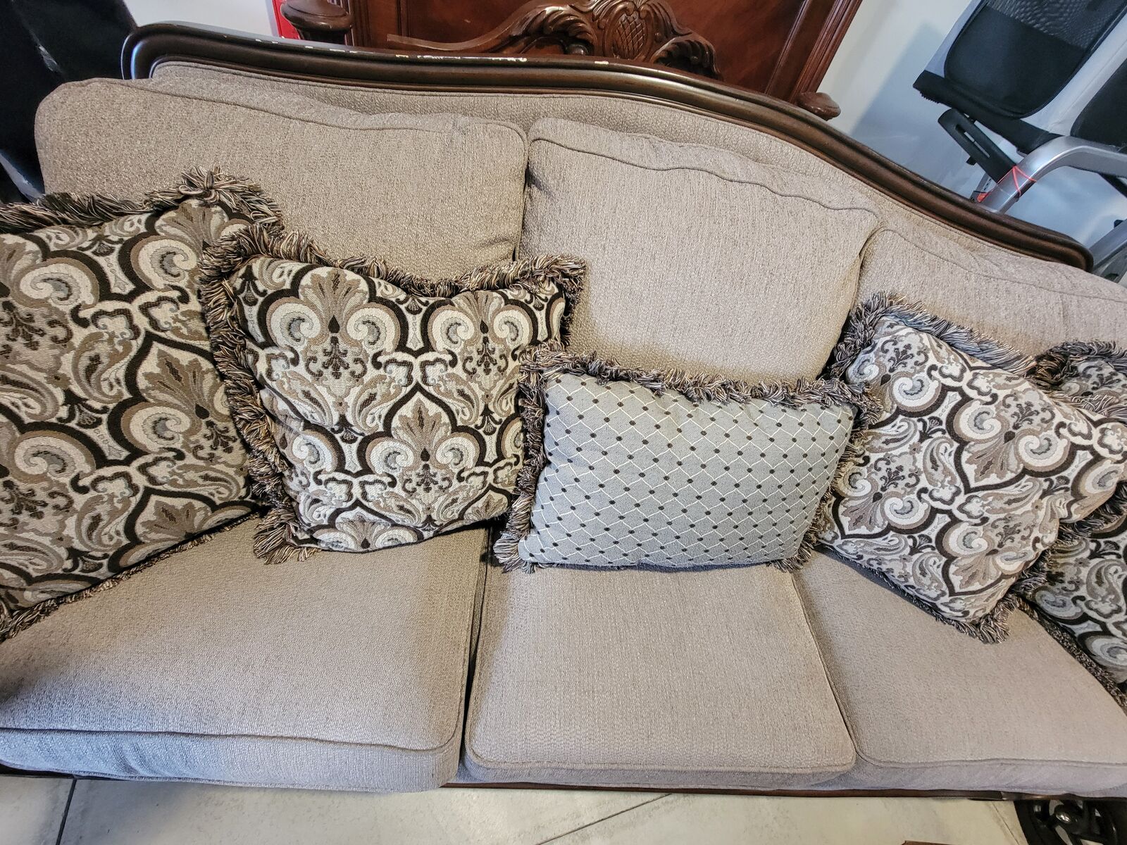 Features:• Solid wood carved frame • Neutral beige fabric • Rolled arms • Includes accent pillows • Clean and well maintained
