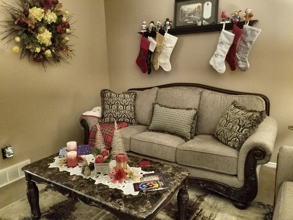 Includes five decorative accent pillows shown in photos (the pillows that match the couch, red pillows are not included). Cushions are firm and comfortable with no rips, stains, or sagging. From a clean, non-smoking, no pet home.