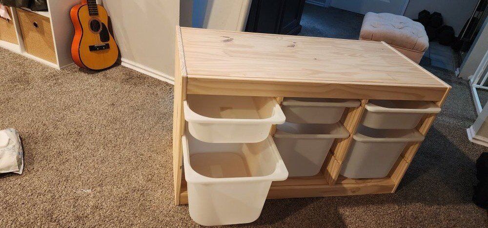 we used it in the kids toy room. no longer need it. comes with baskets.