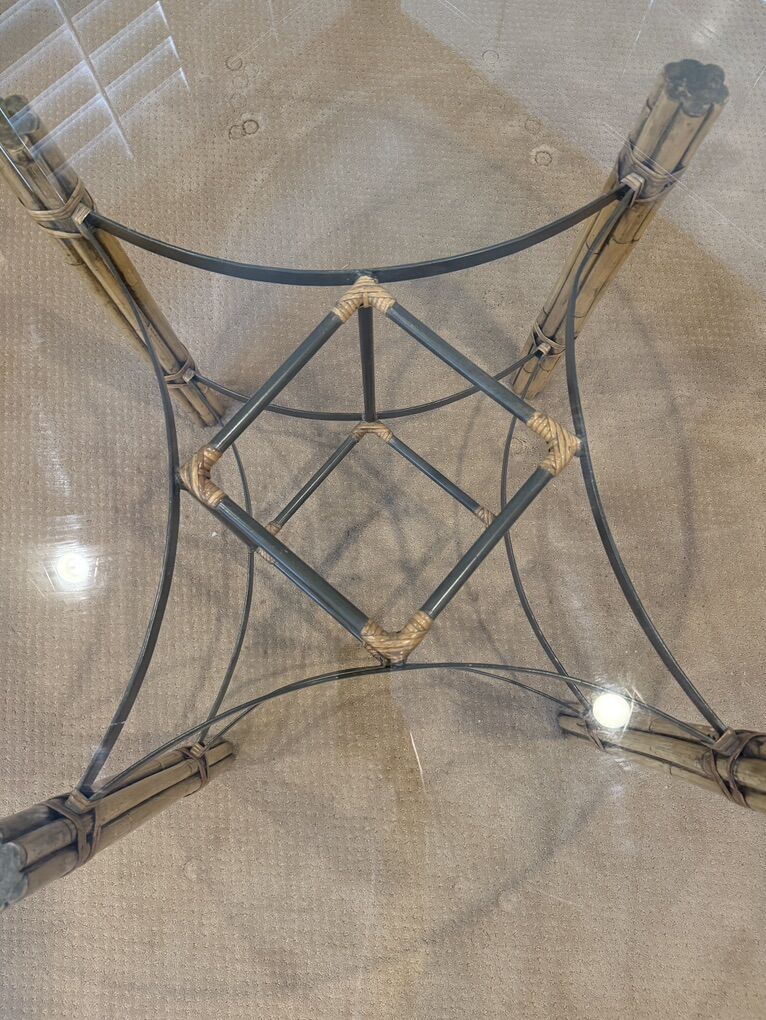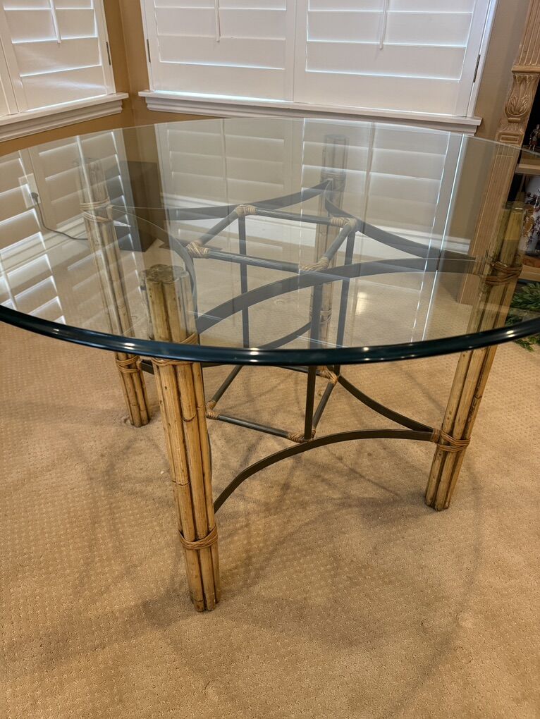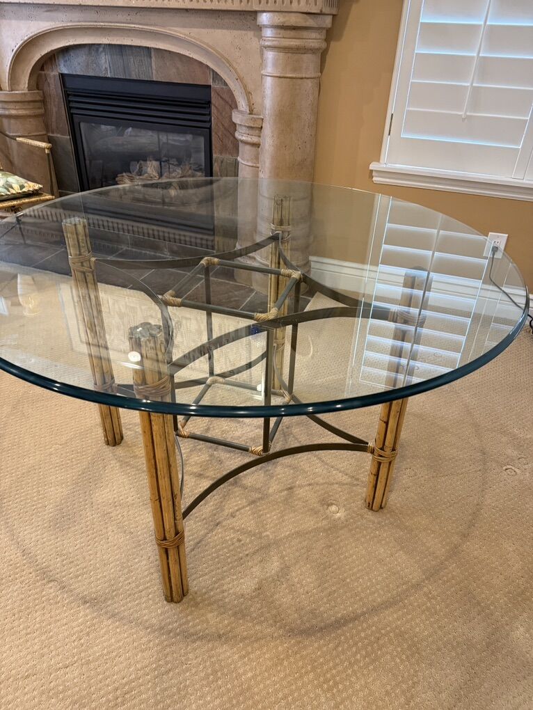 PayPalBeautiful glass table with heavy duty iron base and bamboo-styled legs. 29” tall, 48” diameter. Glass is thick with no major chips or scratches.