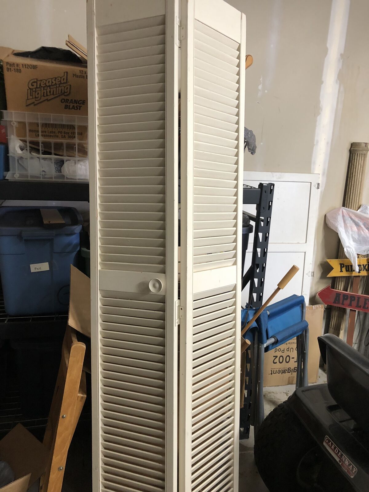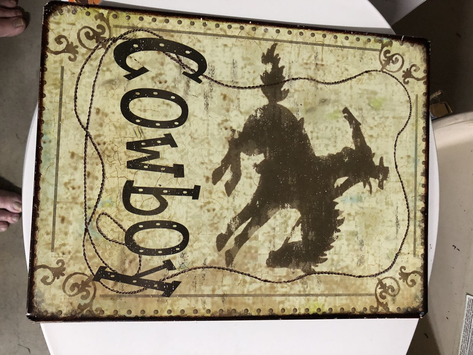 Two folding doors, gold frame, horse picture on canvas,large Halloween bowl, Home Sweet Home sign, tree in basket, metal cowboy sign, wall candle holder, scarecrow wall hanging, owl neclace, two new Tupperware containers nice for back pack for snacks, recipe book, silver tray, wood hamburger maker, new basket for trash or plant, wood stool 23" tall, child's Halloween apron,vintage IZOD towel, 5 each