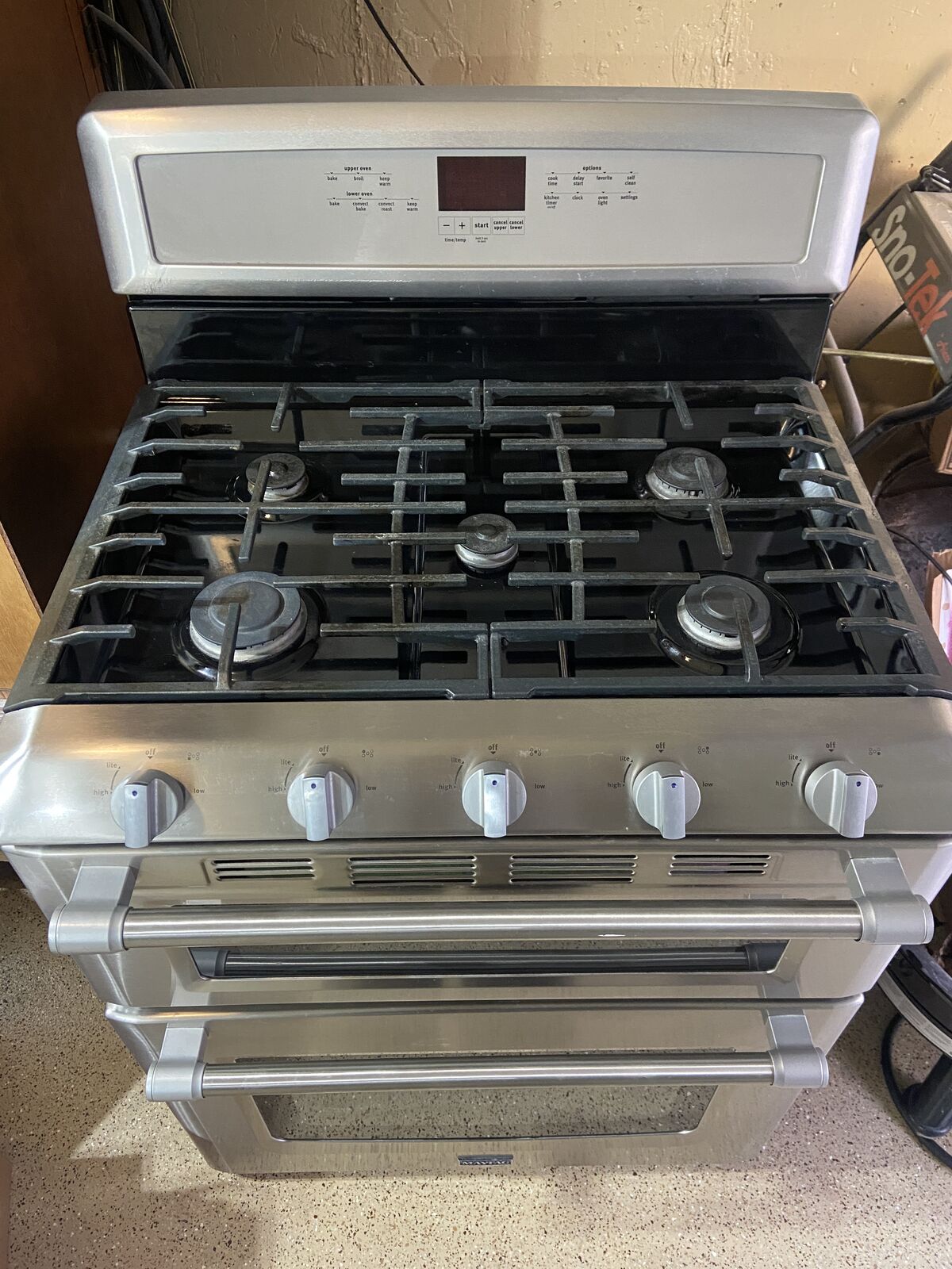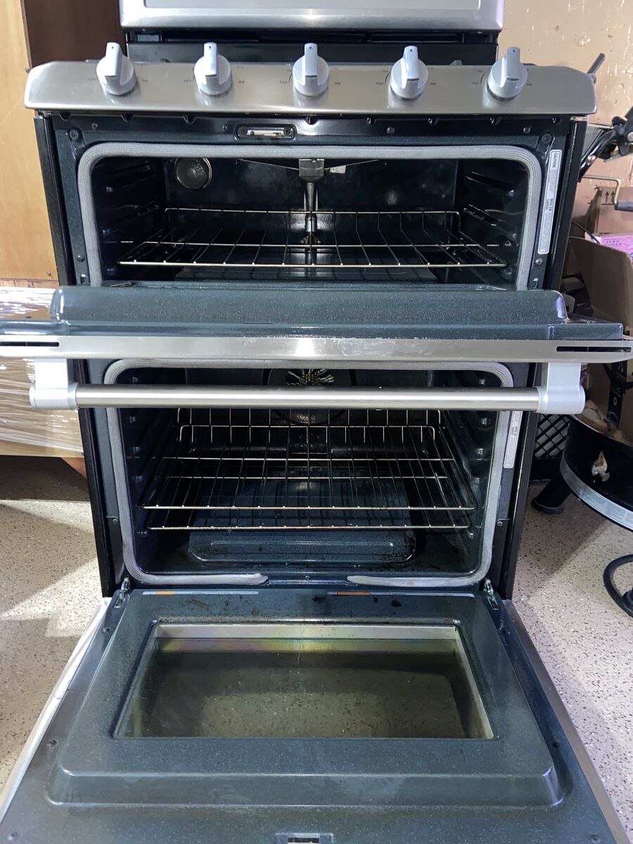 VenmoSelling this lightly used Maytag double oven + gas range. This was brand new and used gently for only around 6 months. It does have some grease marks inside the lower oven door (that i'm sure would come off with the right cleaning products), some wear on the burners, as well as a few tiny scratches on the corners above the burners. That being said it is still in good shape and works perfectly.