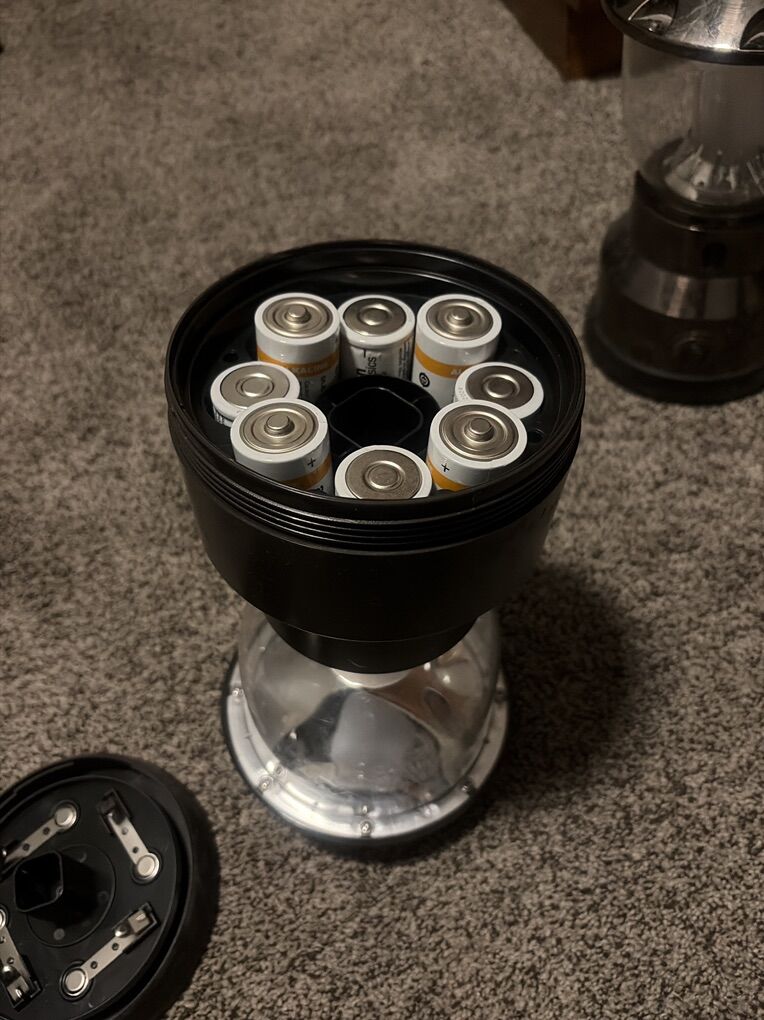 GooglePayThree light settings either super bright, medium or low light perfect for camping or whatever else you need light for. D size batteries. Last for 50,000 hours each battery change. I just put all brand new Amazon batteries so should last you a while on both of these.