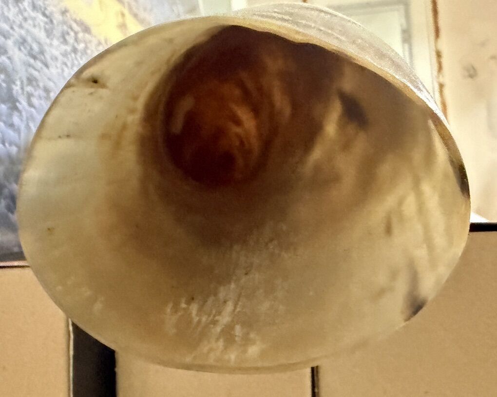 Authentic natural steer horn measuring approx. 25” long with a 2.75”–3.25” oblong opening. Beautiful natural variation in color with dark tip and creamy body. No cracks and no visible maker marks.