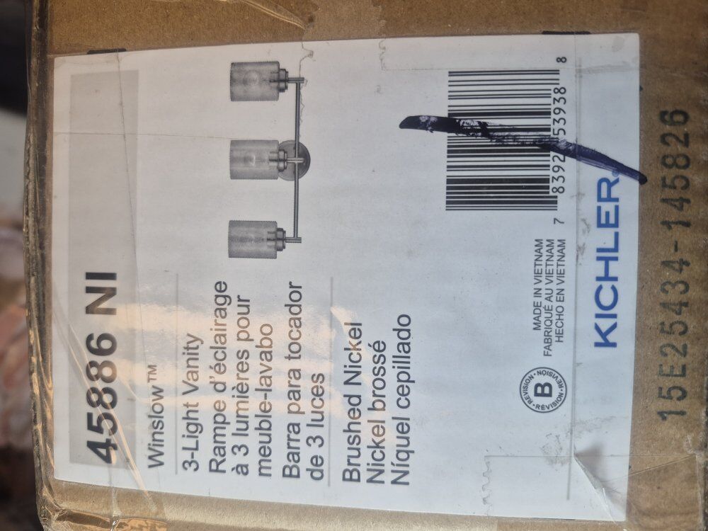 New Kichler Winslow 3-light vanity light. Has a brushed nickel finish with cool seeded glass shades. Still in box, never used. Model: 45886 NI