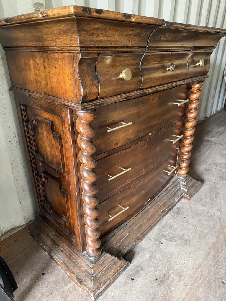 Features: • Solid wood construction • Barley twist (spiral) front columns • Flip-top mirror with hidden storage compartment • 3 large lower drawers • 3 smaller upper drawers • Heavy, sturdy base • Unique carved side detailing