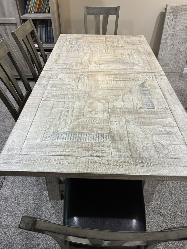 Price: $450 OBO (Original retail: $1,100 – Save $650) Gorgeous solid wood dining table with a stunning whitewashed/lime-washed finish and intricate carved geometric pattern on the tabletop. This set has that perfect modern farmhouse / boho vibe that looks amazing in any home. • Heavy, sturdy construction – built to last • Table measures approximately 96” L × 40” W × 30” H (78” without insert) seats 6 comfortably, currently shown with 4 chairs. Seats 10 with extension • 4 matching high-back dining chairs with distressed gray frames and black upholstered seats (super comfortable) • Excellent condition – barely used, no scratches or wear are intentional distress from the manufacturer • Smoke-free home Perfect for family dinners, game nights, or just making your dining area look magazine-worthy. Cash only. Pickup only [Syracuse, Utah]. Serious buyers only, please – this set won’t last long at this price! Text me if you need more pictures or have questions. Text: (801) 390-7795 Derrick