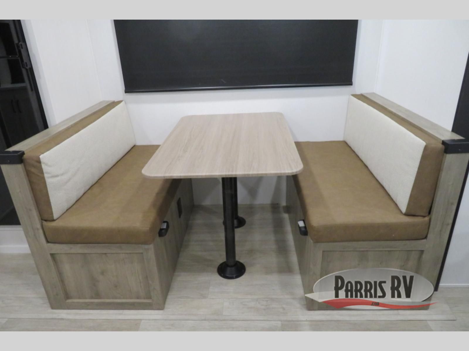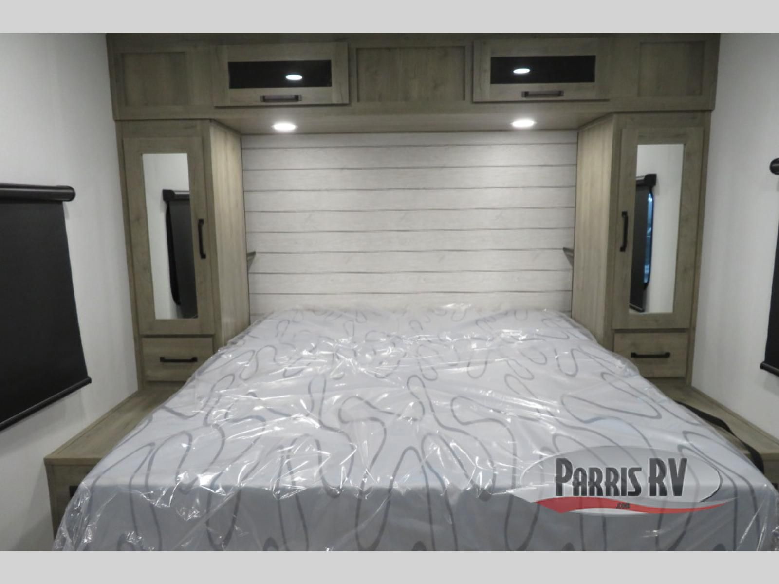 You'll love every minute spent in this travel trailer, whether at the lake or in the woods! Once you arrive at the campground, you can unload the pass-thru storage, then start lunch in the rear corner kitchen. There is a bar top with two seats where you can dine at, and an added booth dinette slide provides more seating space, as well as sleeping space for guests. You'll enjoy having the front RV queen bed to yourselves, and there are dual bedside wardrobes to keep your things tidy.