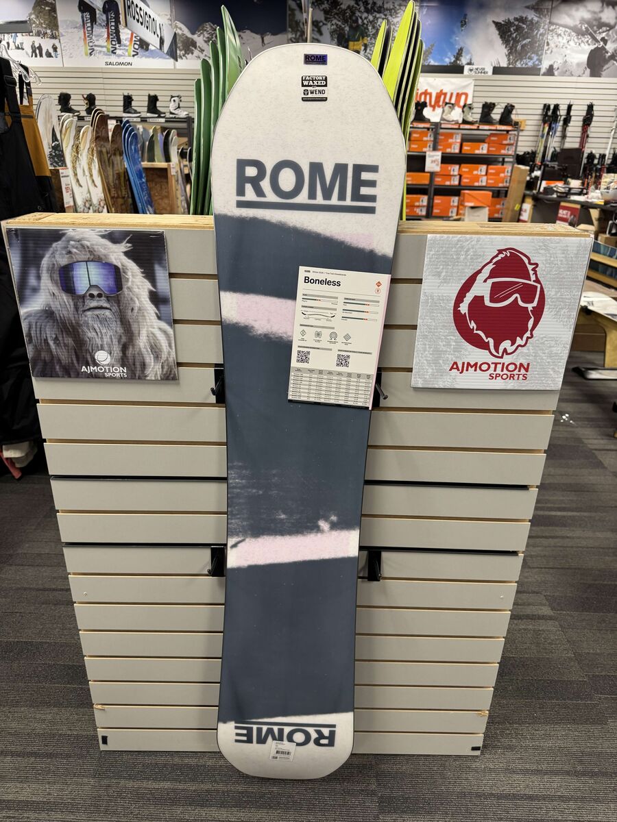 Shop online or in-store, all items can be purchased at ajmotion.com and shipped right to your door! Condition: Like New – Looks and feels nearly unused with minimal or no signs of wear. Topsheet Condition: Like-New – Nearly flawless with minimal or no marks. Base Condition: Like-New – Smooth, freshly tuned base with no visible damage. Edge Condition: Like-New – Sharp, clean edges with no rust, dings, or wear. Specs: Year: 2026 Brand: Rome Model: Boneless Type: Snowboard Size: 150CM About AJ Motion Sports: Aspen Plaza 867 East 9400 South, Sandy, UT 84094 Stop by for unbeatable deals! Feel free to call us at 385-262-3644 for more info. Reliable Used Gear Find hidden gems in our constantly updated collection of used rental gear, including skis, snowboards, boots, bindings, and poles. Check back often—new arrivals drop regularly! Savings on New Gear Get deals on the essentials, from gloves and boots to facemasks, helmets, clothing, goggles, and flat skis.