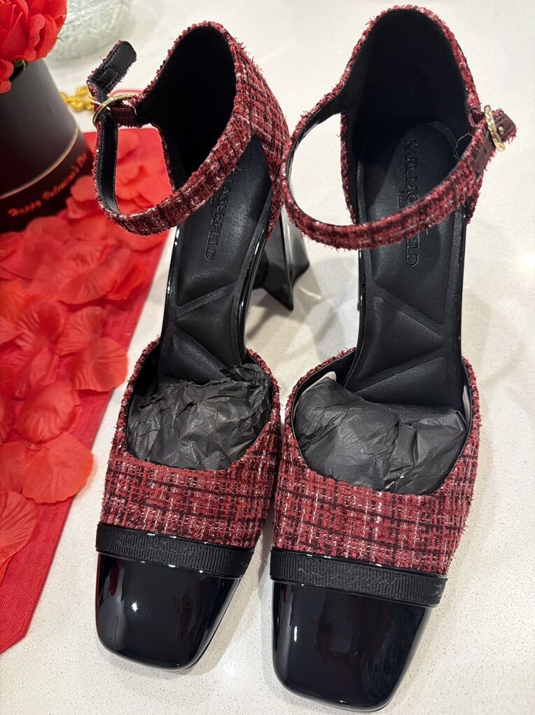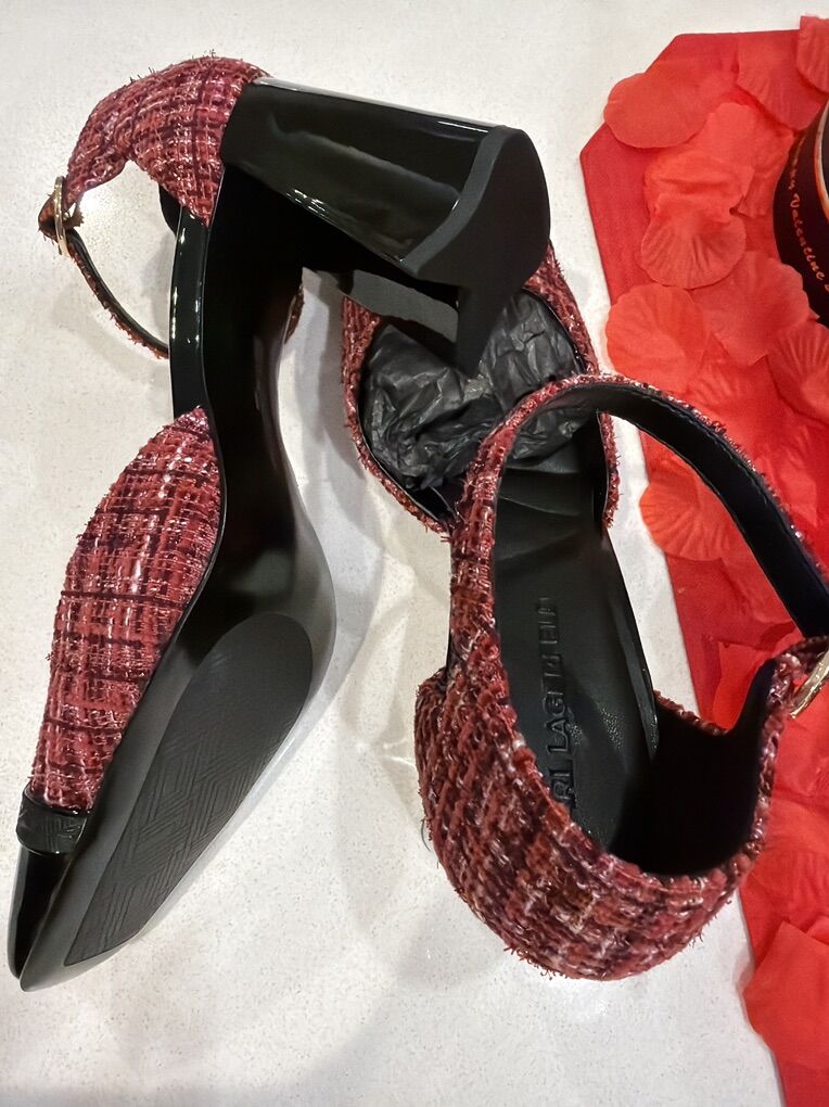 These Karl Lagerfield Paris Pumps are brand new. They are Size 9.5 Wine/Black Plaid Block Heel Ankle Wrap Pumps. However, the 9.5 Size is actually a Size 10. This is a beautiful shoe with a soft Black padded instep with a patented technology. They are so comfortable, but it is too large for my foot size. The original price was $120.00.