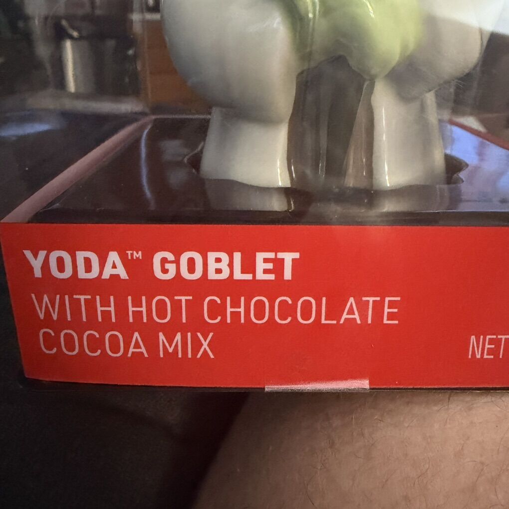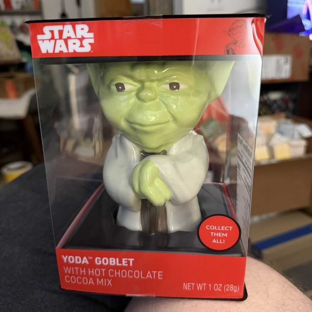 ApplePayUp for your consideration here as a ceramic Yoda goblet with a pack of hot cocoa mix, new in its original packaging and still sealed.