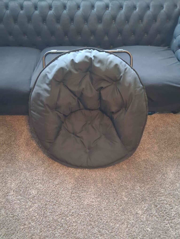 ApplePayRound adult size saucer chairs in black, weight limit 275, folding for easy storage, comfy cushion, and good material for easy cleaning. Comes from a pet free/smoke free home. Will meet you at a half way point.