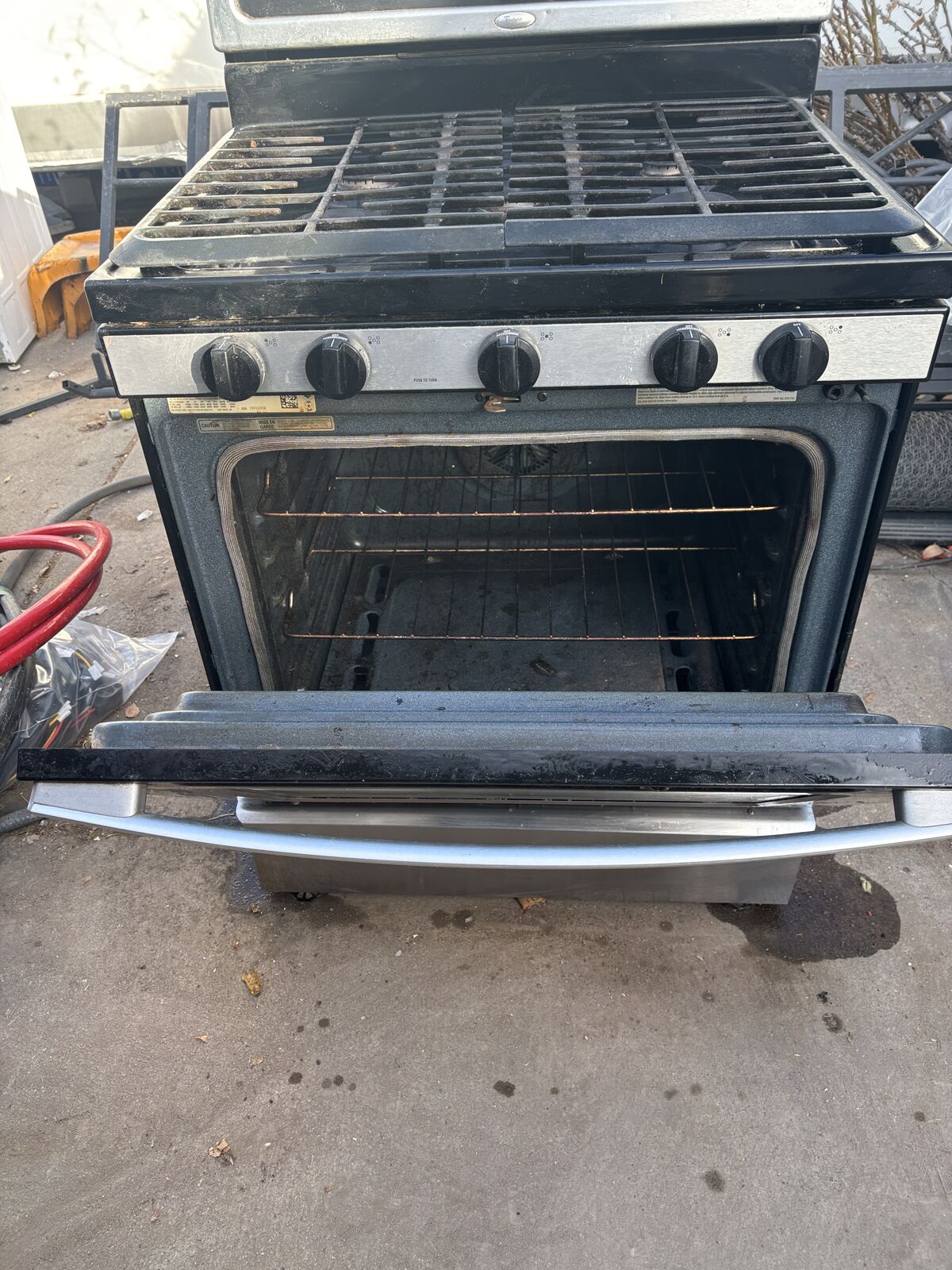 This is a used @+ Stove Whirlpool Gas Stainless 5 Burners Stove, Range, Self Ceaning Oven in good working condition