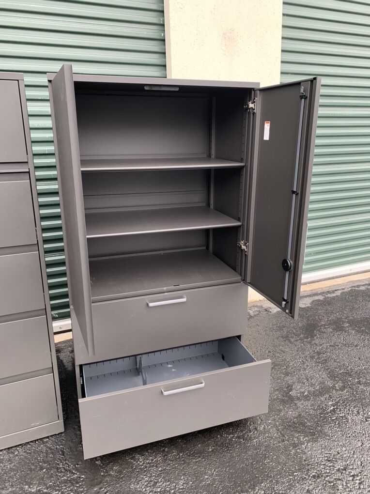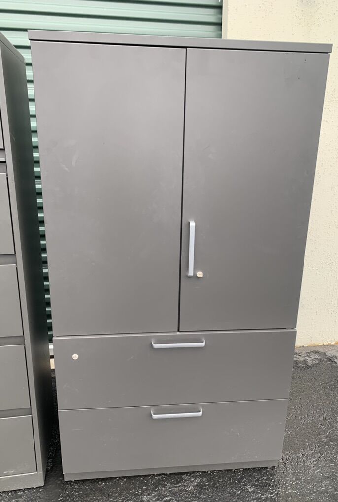 1 each Steelcase 36” wide 65” high 24” deep double door shelf with 2 drawers heavy duty storage cabinet. $150.00 each delivered.