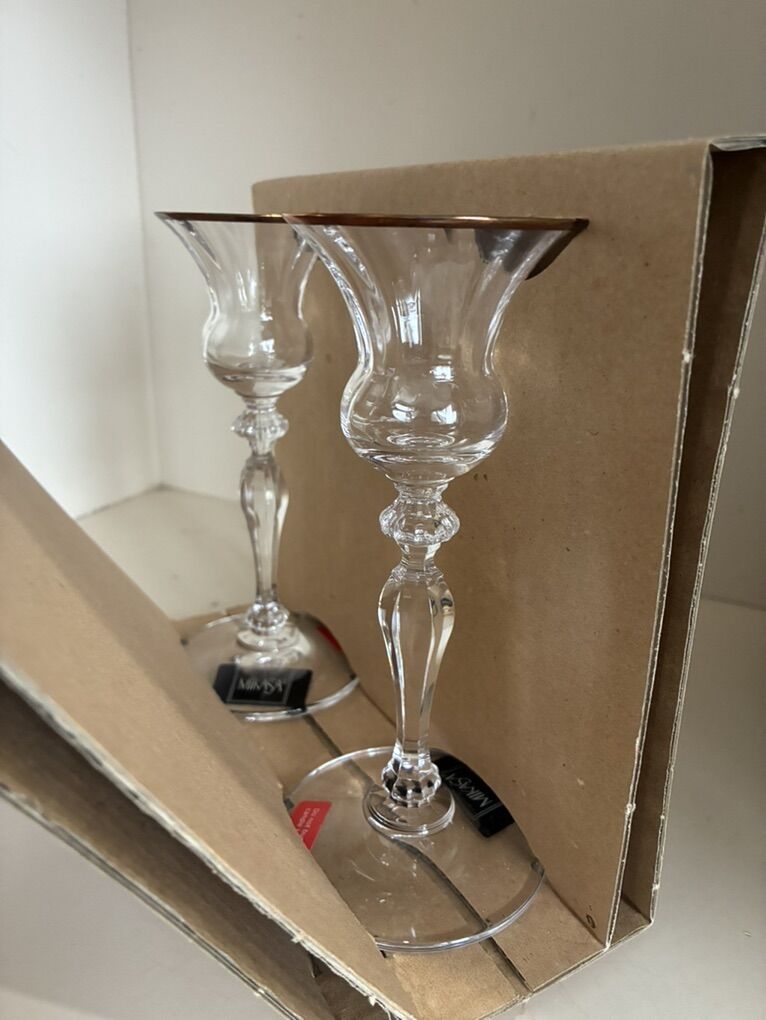 Venmobundle of two 6inch glass candle holders with gold rim. never used! comes with the original box.