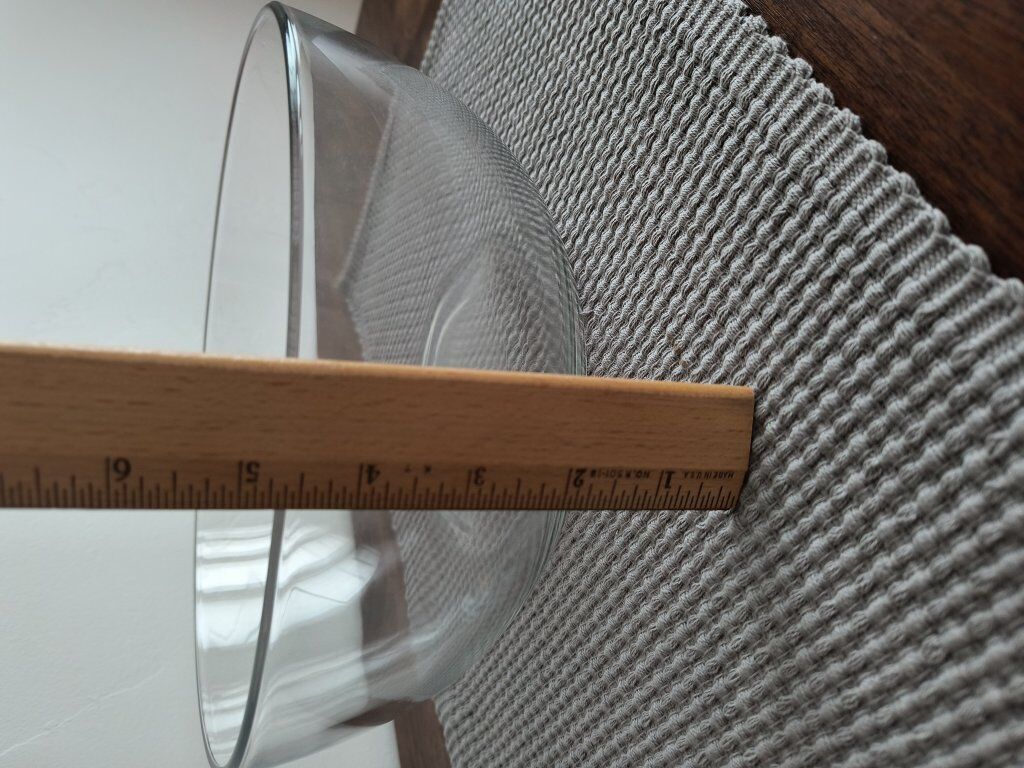 Glass serving bowl, approx. 4.5 inches tall and 11 inches wide at the rim.