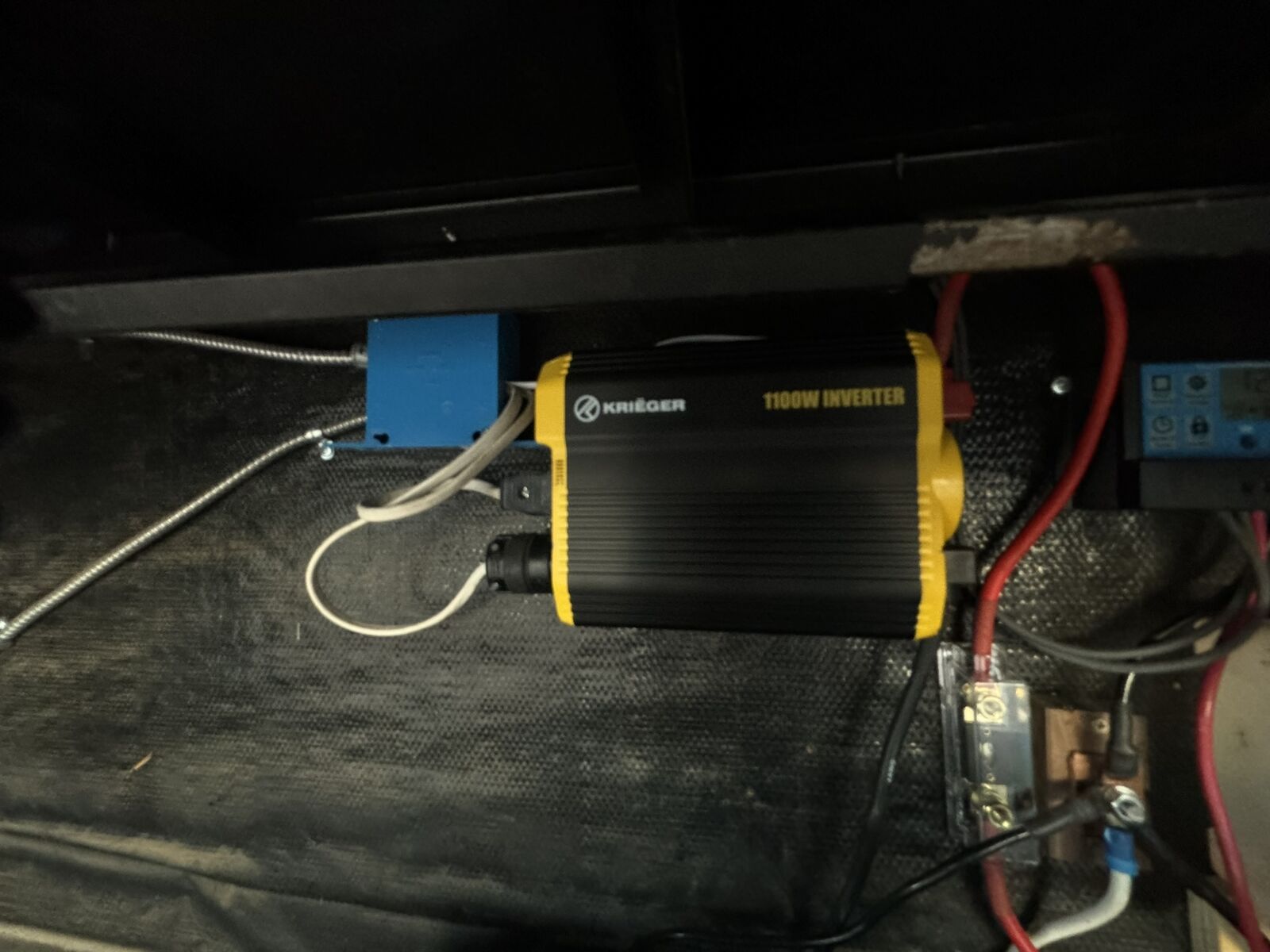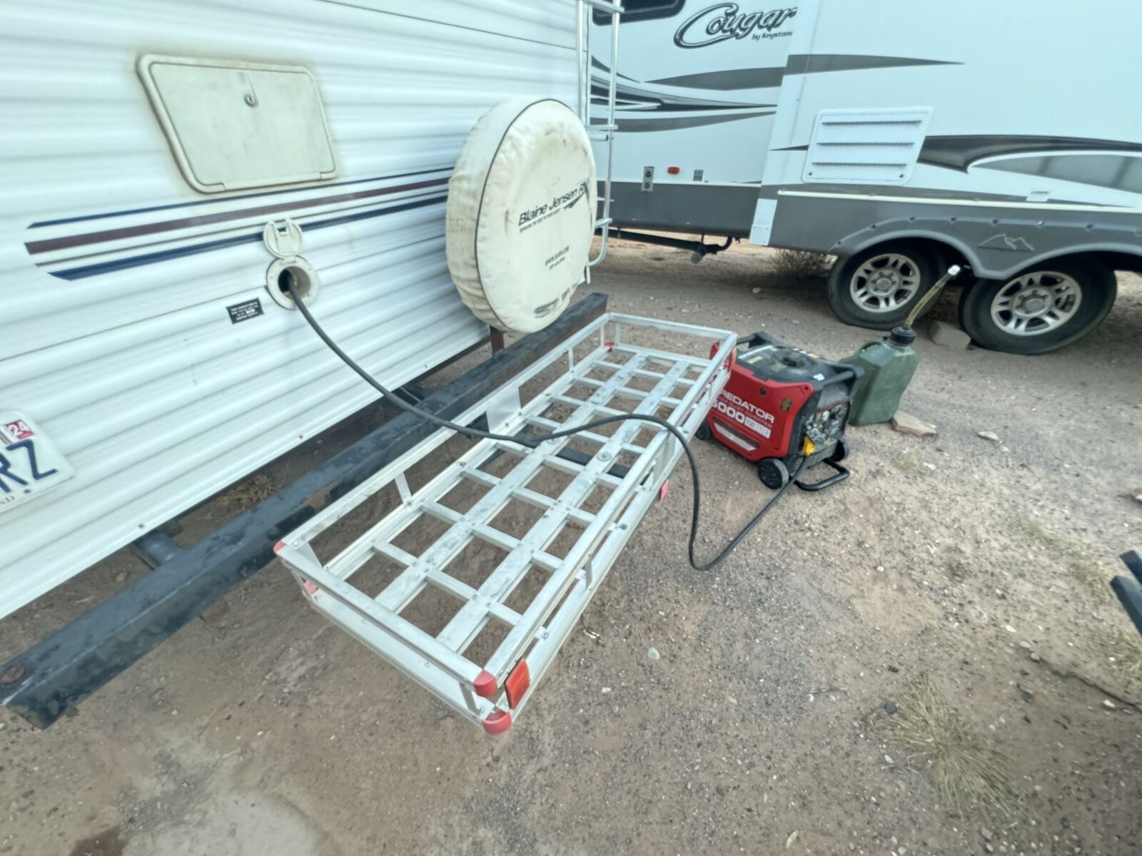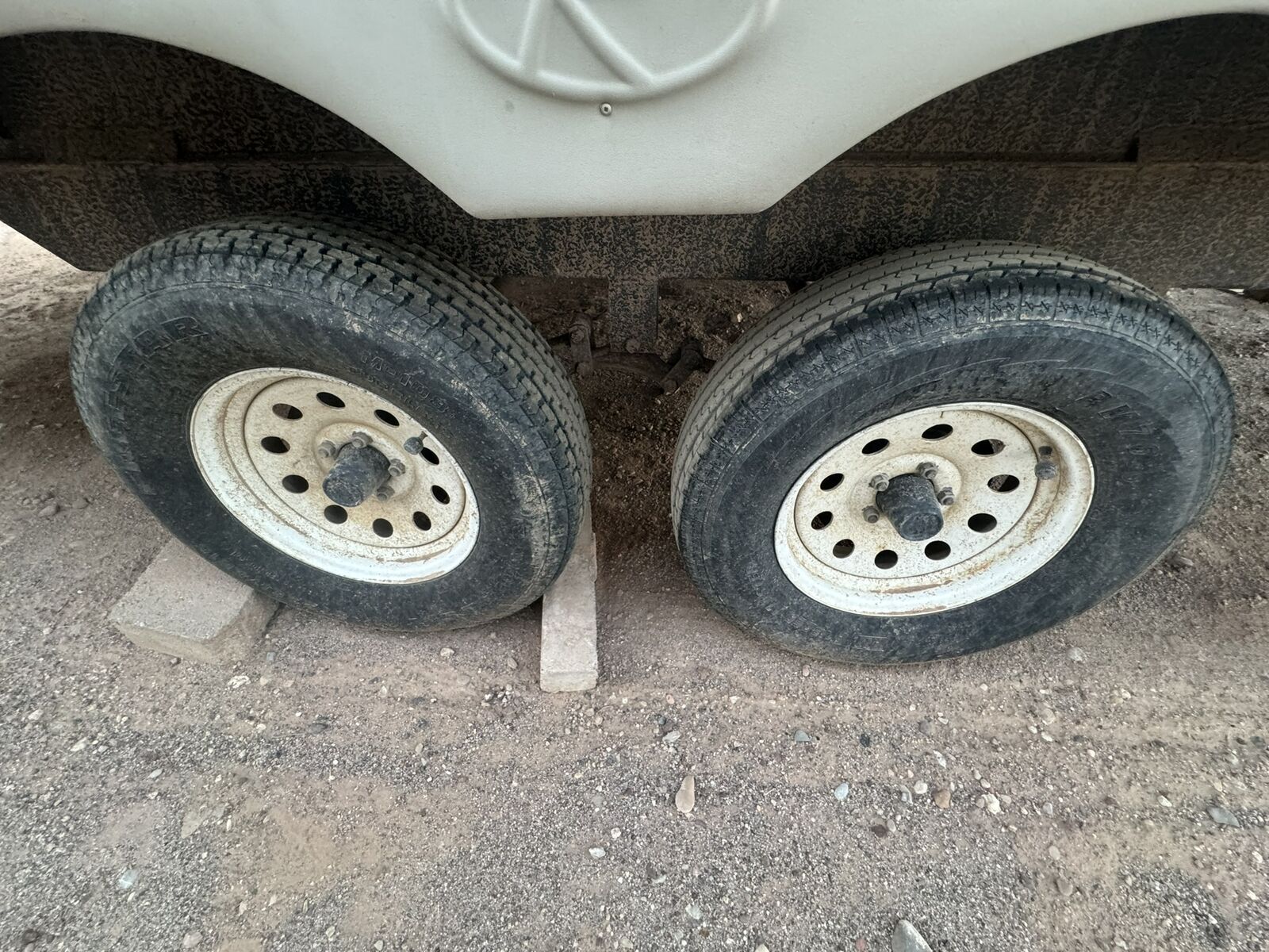 For sale: A well-maintained RV with many upgrades. Owned for 7 years, it features 2 solar panels that keep the 4 golf cart batteries fully charged, plus a 1100 watt inverter with multiple interior plugs for off-grid convenience. Includes a new American flag awning with LED lights, a removable rear rack for extra gear, a Bluetooth stereo with DVD player, and an outdoor shower. Other perks: LevelMatePRO for easy leveling, a cell phone signal booster, and a gooseneck trailer attachment. The stove was removed for extra storage, and a removable shelf was added in the bathtub for additional closet space.