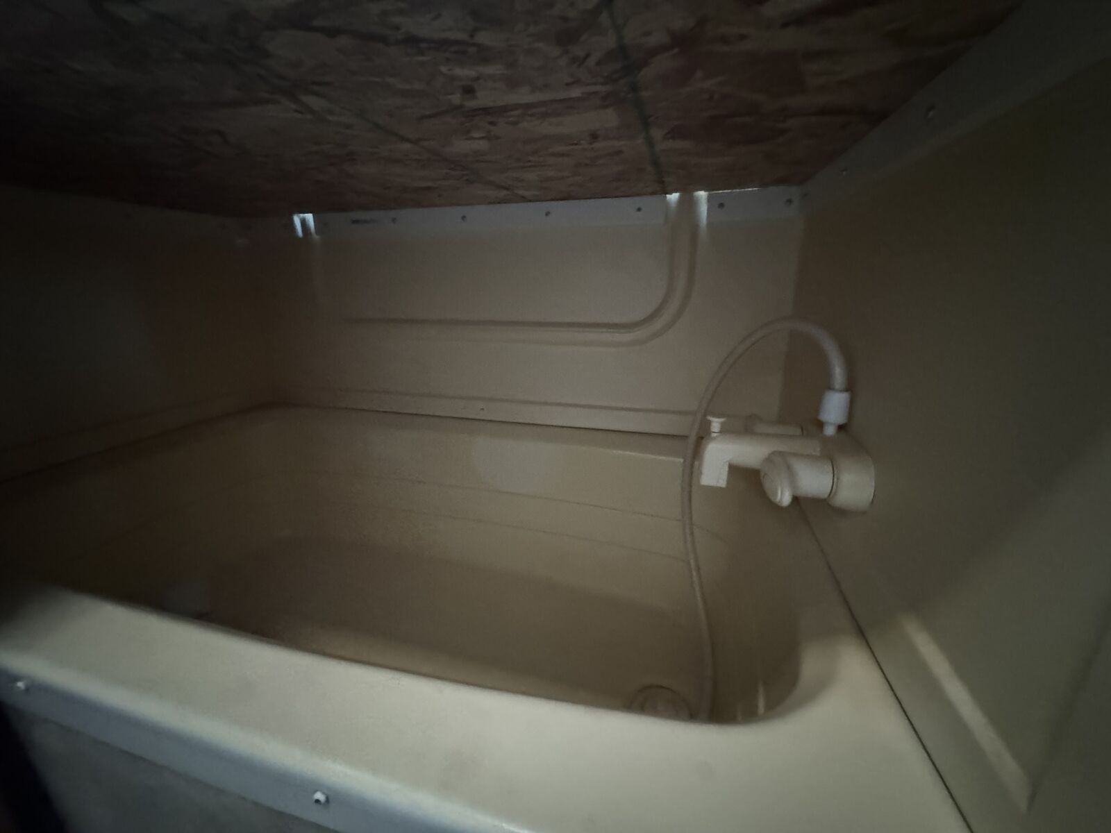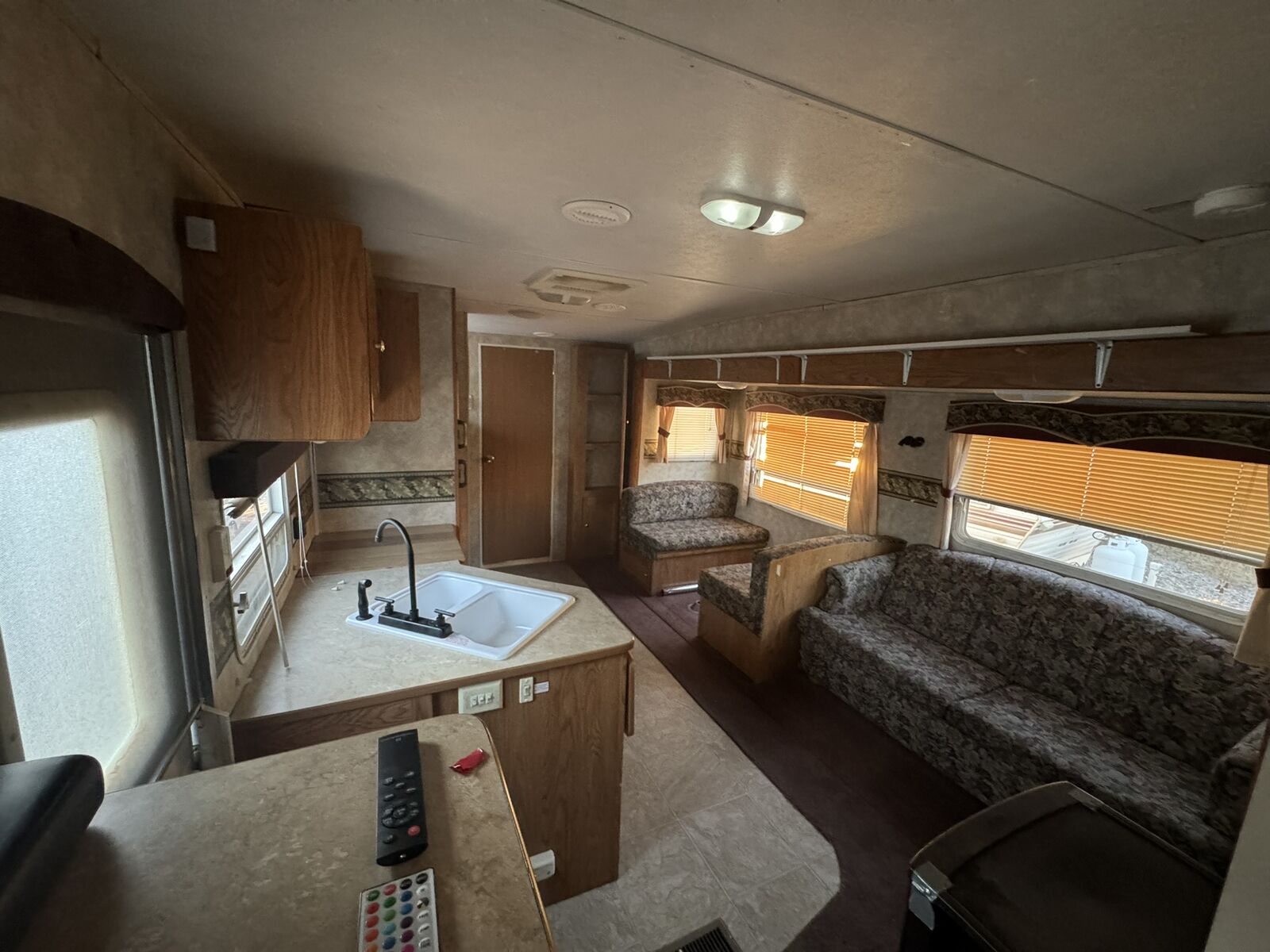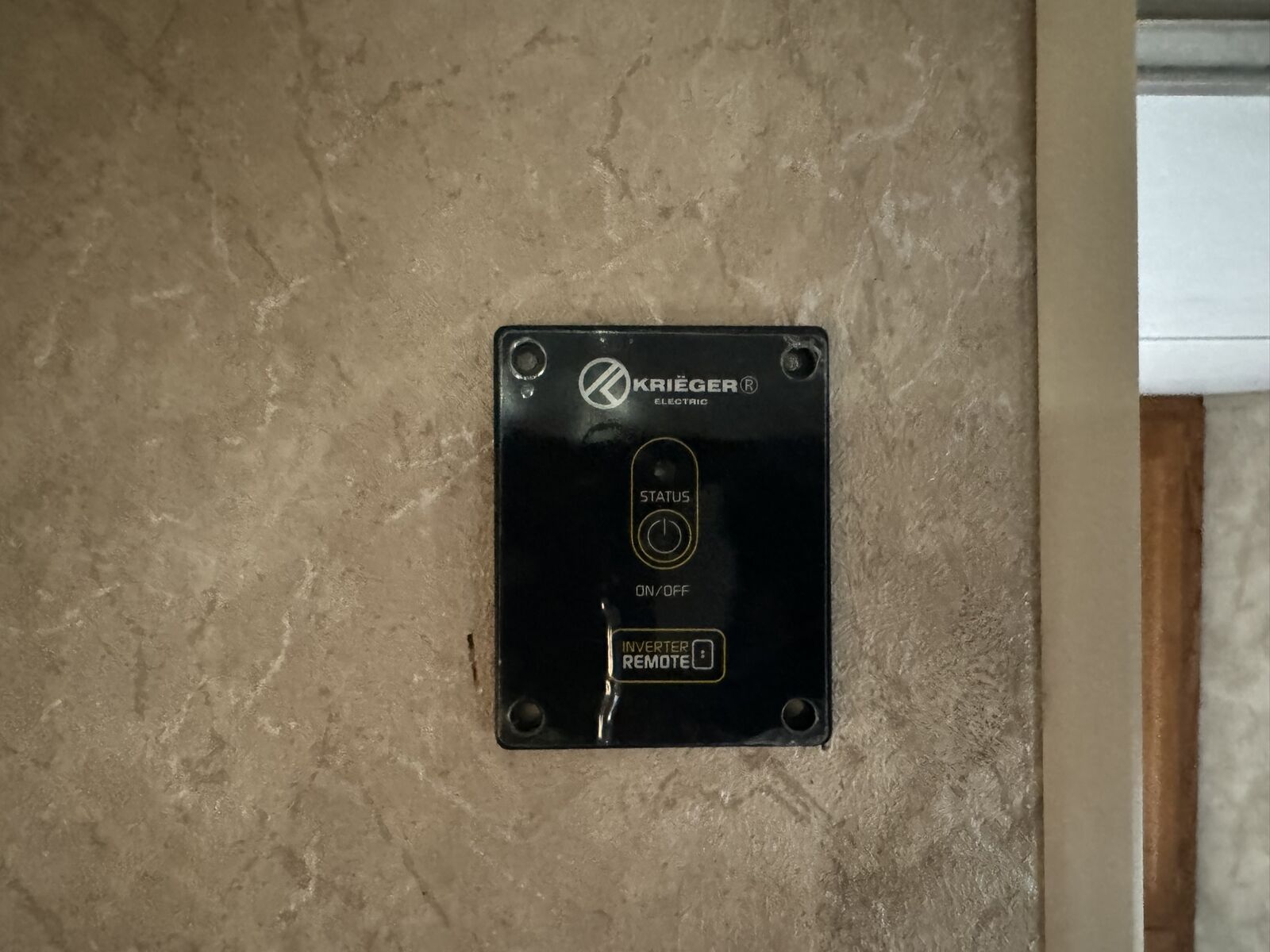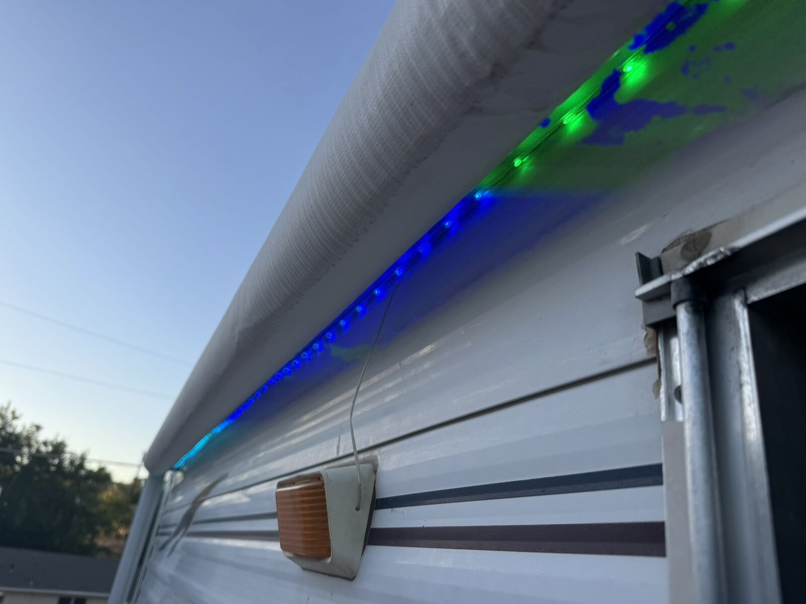 For sale: A well-maintained RV with many upgrades. Owned for 7 years, it features 2 solar panels that keep the 4 golf cart batteries fully charged, plus a 1100 watt inverter with multiple interior plugs for off-grid convenience. Includes a new American flag awning with LED lights, a removable rear rack for extra gear, a Bluetooth stereo with DVD player, and an outdoor shower. Other perks: LevelMatePRO for easy leveling, a cell phone signal booster, and a gooseneck trailer attachment. The stove was removed for extra storage, and a removable shelf was added in the bathtub for additional closet space.