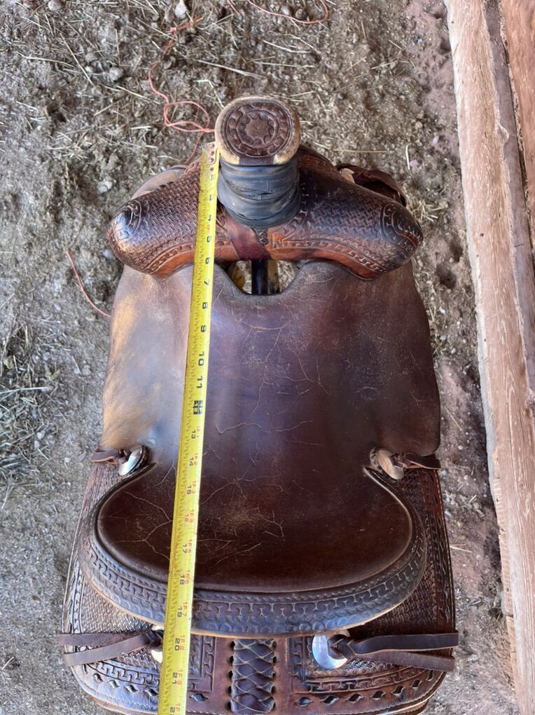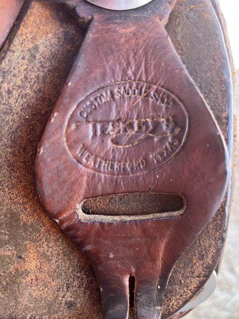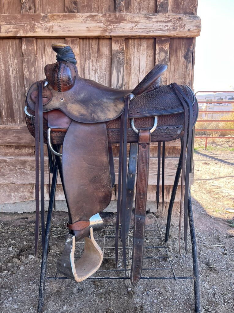 Super solid rough out teskey roping saddle, in very good condition. It has a wide tree and a 15 in seat. This saddle has been awesome, but I need to clean out my tack shed. Message me with any questions