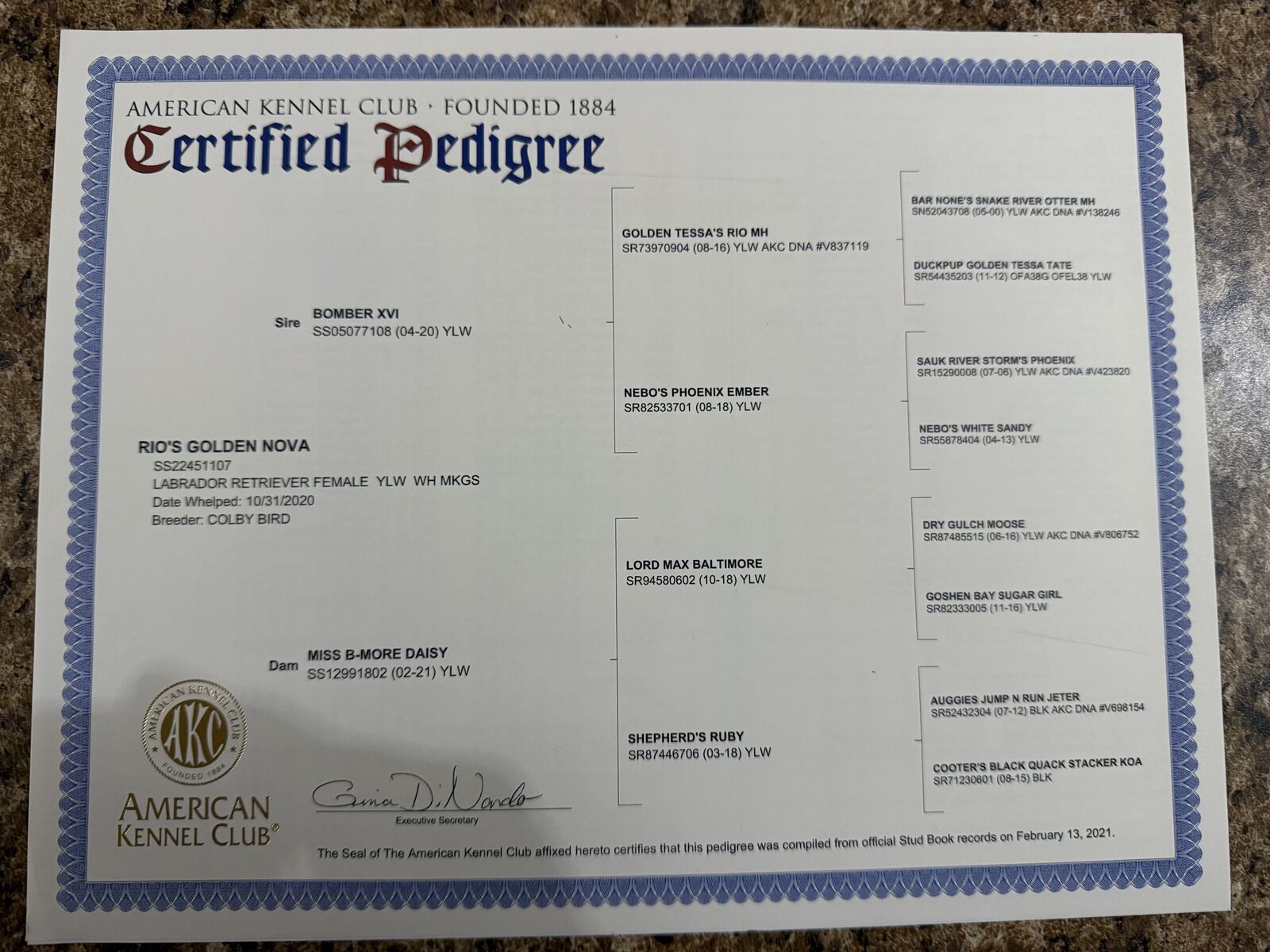 Nova is our 5 year old, yellow lab. your looking for a lab out of the puppy stage and is ready to go this is it. We're sad to sell her, but our lifestyle has changed and we're busy chasing sports around and I don't have that much time to keep working and hunting with her. I'd rather see her with someone that can take her out hunting as much as possible. Her Grandpa is Golden Tessas Rio who is a 4xGMPR out of the state of Utah. This dog has the bloodlines and the drive that thats all this dog was bred for was to hunt. Shes also amazing for our little kids! Ive never bred her and she's not spayed. Health checks are all good. Serious inquires only.