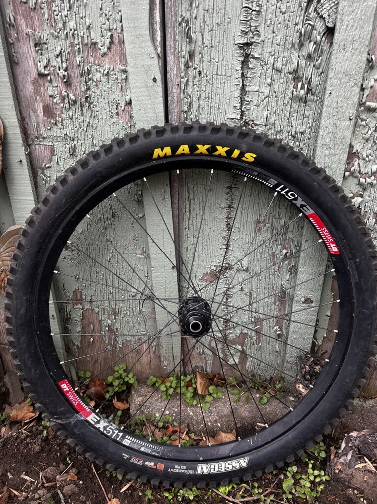 ApplePayDT Swiss EX 511 laced to 15mmx100mm DT Swiss 240 S downhill hub wrapped with Maxxis Assengai 2.6 like new tire. Rim is perfectly true. Valve stem hole can't accept Schrader or Presta stems.